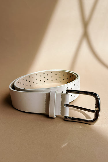 Sleek and stylish, the Harper White & Silver Buckle Belt is the perfect blend of modern design and timeless versatility. Crafted from smooth ivory leather, this belt features an open-hole dots design for a unique, eye-catching touch.