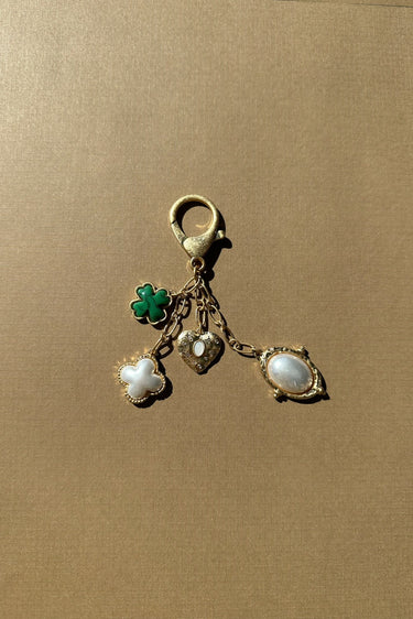 The Lucky Bag Charm brings a touch of charm and sparkle to your favorite handbag. With gold hardware and a lobster claw closure, this accessory combines elegance and good fortune. It features a green clover charm, a white pearl clover, a white pearl oval, and a gold heart adorned with rhinestones and an iridescent stone at its center.