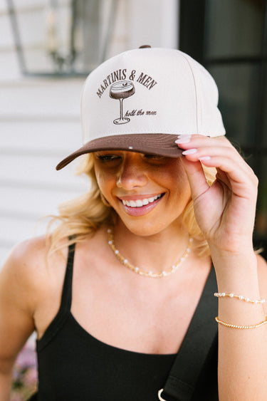 Pour up some playful sass with the Martinis & Men Trucker Hat - a cheeky cap for cocktail lovers with a sense of humor. This cream and brown trucker-style hat features brown embroidery that reads "Martinis & Men, hold the men" alongside a classic martini glass graphic. A snapback closure ensures an adjustable fit, and the back adds an extra smile with embroidered text that reads “the happiest :)” for a fun finishing touch.