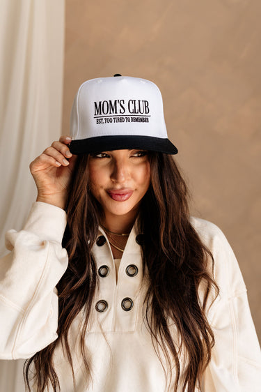 Join the fun with the Mom's Club Trucker Hat. This hat features a crisp white front with a contrasting black bill, making it a stylish choice for any casual day. The front proudly displays "Mom's Club Est. Too Tired To Remember" in black embroidery, capturing the humorous side of motherhood. The back adds a touch of positivity with "the happiest :)" also in black. Designed with an adjustable back for a perfect fit, this trucker hat blends comfort with a playful, relatable message for all the amazing moms out there.