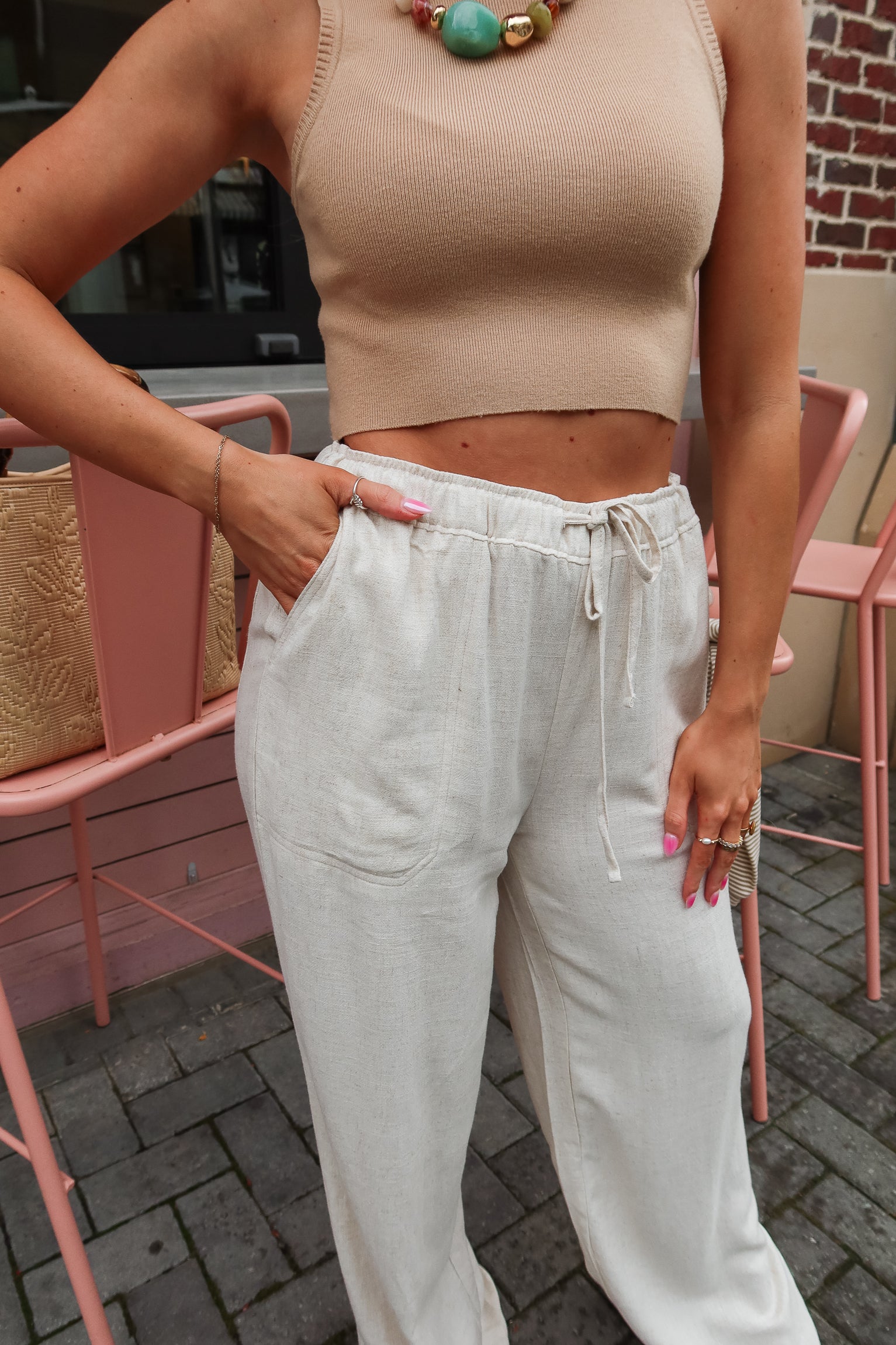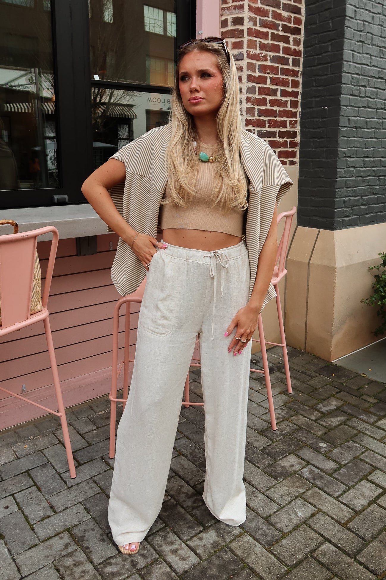 The Camryn Natural Linen Wide Leg Pants offer relaxed, timeless style with effortless versatility. Crafted from lightweight natural linen fabric, they feel soft and breathable. The wide leg silhouette allows comfortable movement throughout the day. The neutral tone pairs easily with tanks, blouses, or casual tops, making them a staple for vacations, errands, and everyday wear. An elastic waistband with a drawstring ensures a flexible, easy fit.
