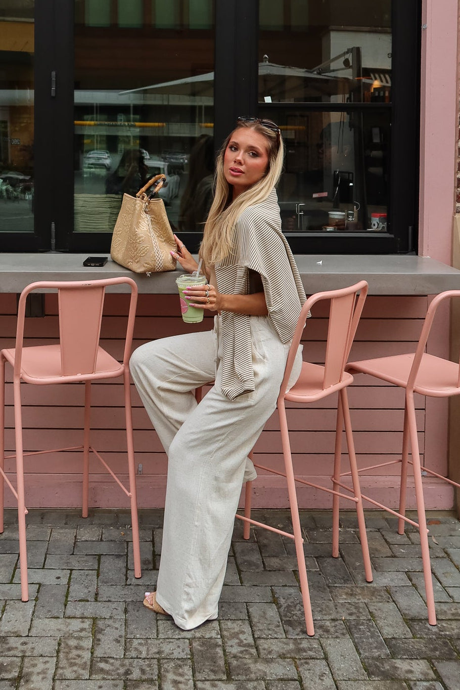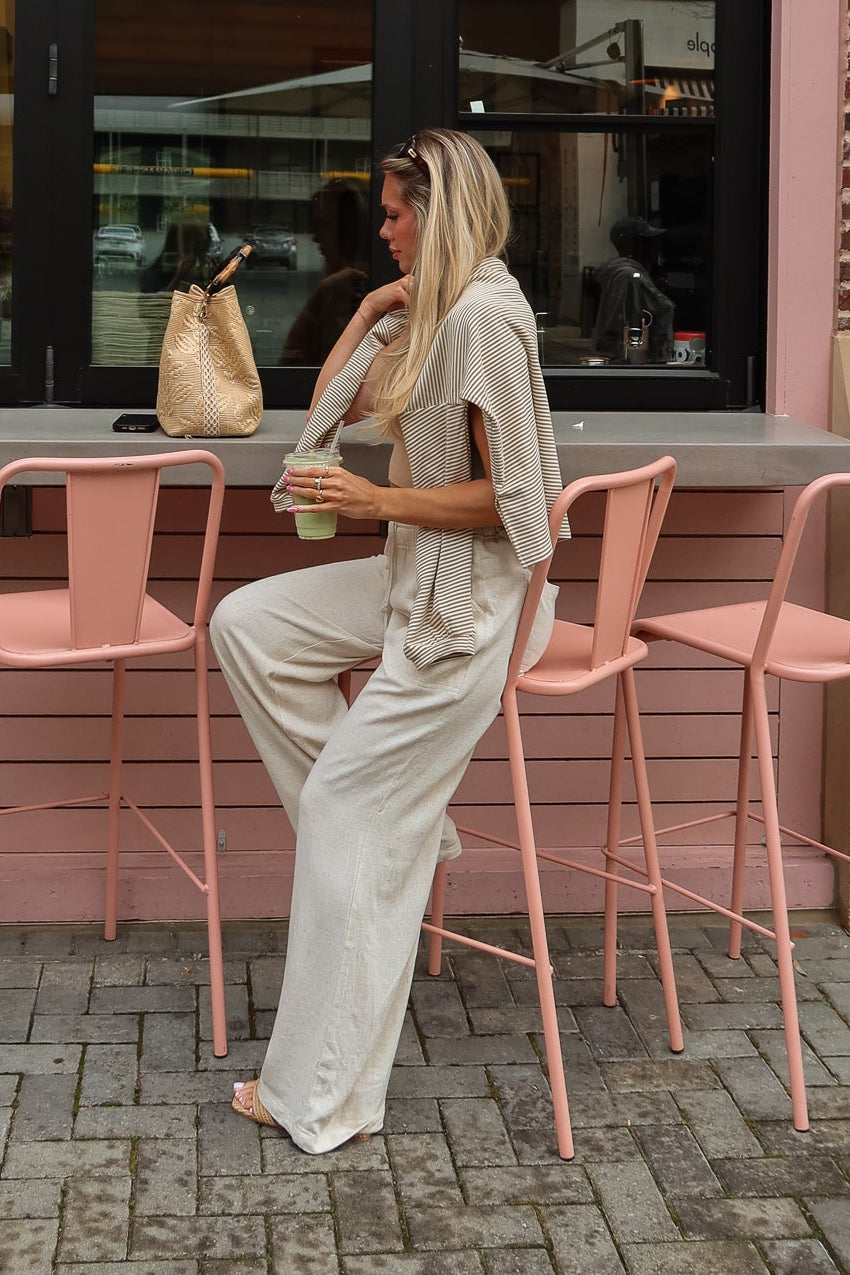 Designed with both side and back pockets, these pants blend functionality with polished appeal. The breezy linen and flattering wide leg shape create a look that transitions seamlessly from casual daytime outfits to elevated evening styling. Pair them with sandals for laid-back days, sneakers for travel, or heels for a more refined finish.