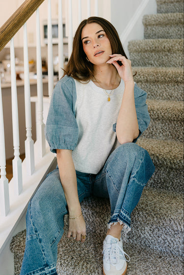 What truly sets this top apart are the denim short sleeves, which introduce a unique contrast and a modern twist to an otherwise classic silhouette. The denim detail adds texture and visual interest, giving the piece a stylish edge while remaining easy to wear. A simple round neckline keeps the design clean and versatile, making it perfect for layering or wearing on its own.