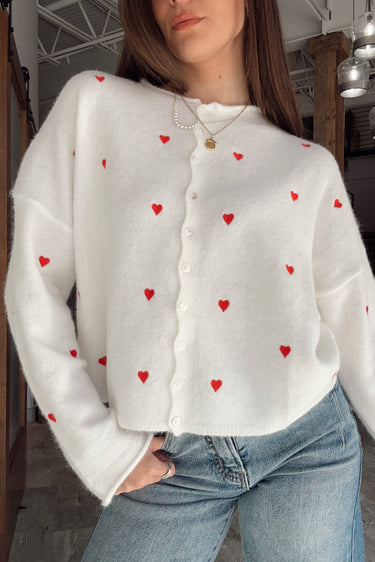 Sweet and cozy with a playful twist, the Emilia White & Red Hearts Cardigan is a charming layering piece designed to stand out. Crafted from soft ivory knit fabric with bold red heart detailing, this cardigan adds a fun yet feminine touch to your wardrobe. The classic round neckline and front button-up design create a timeless silhouette that’s easy to style.