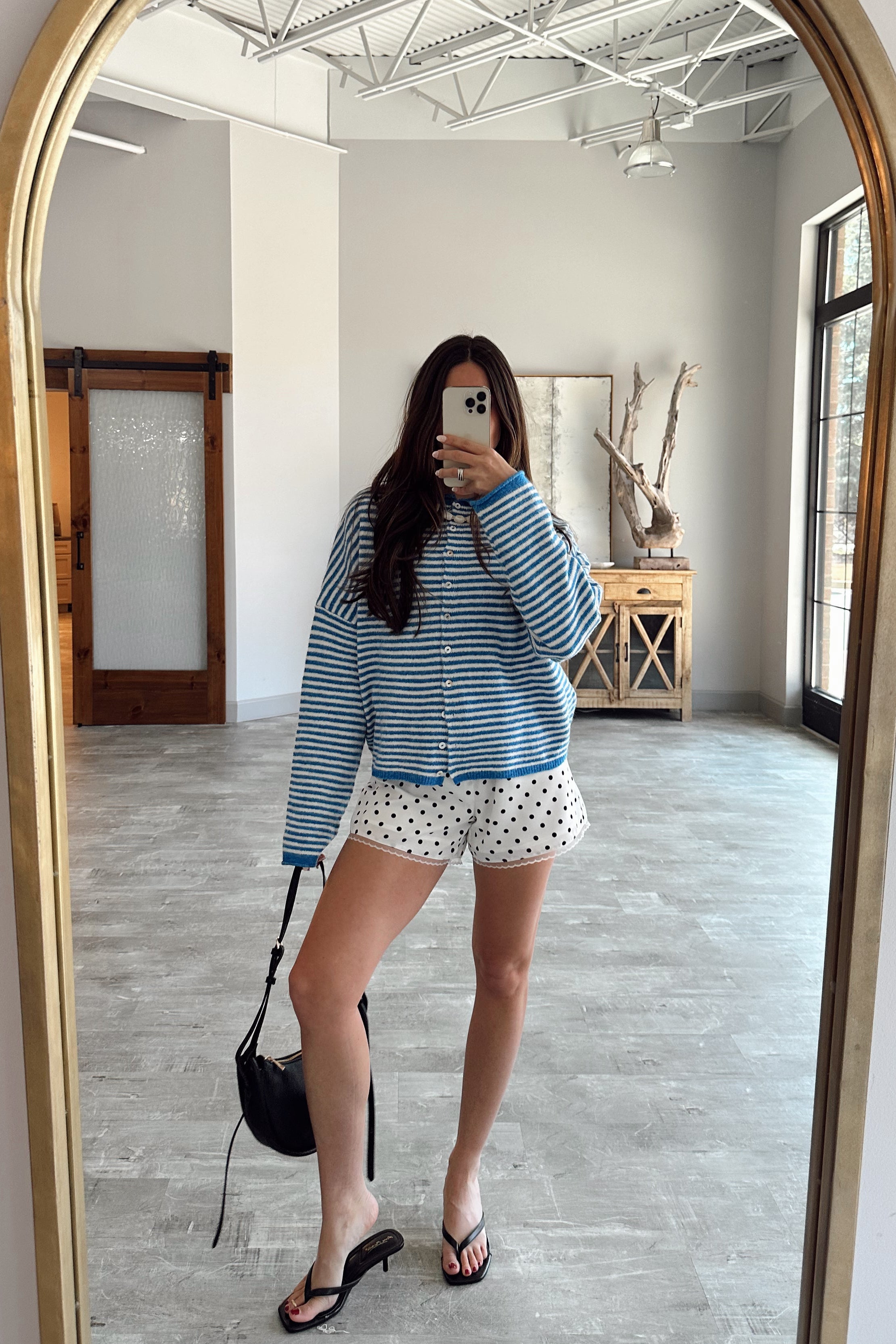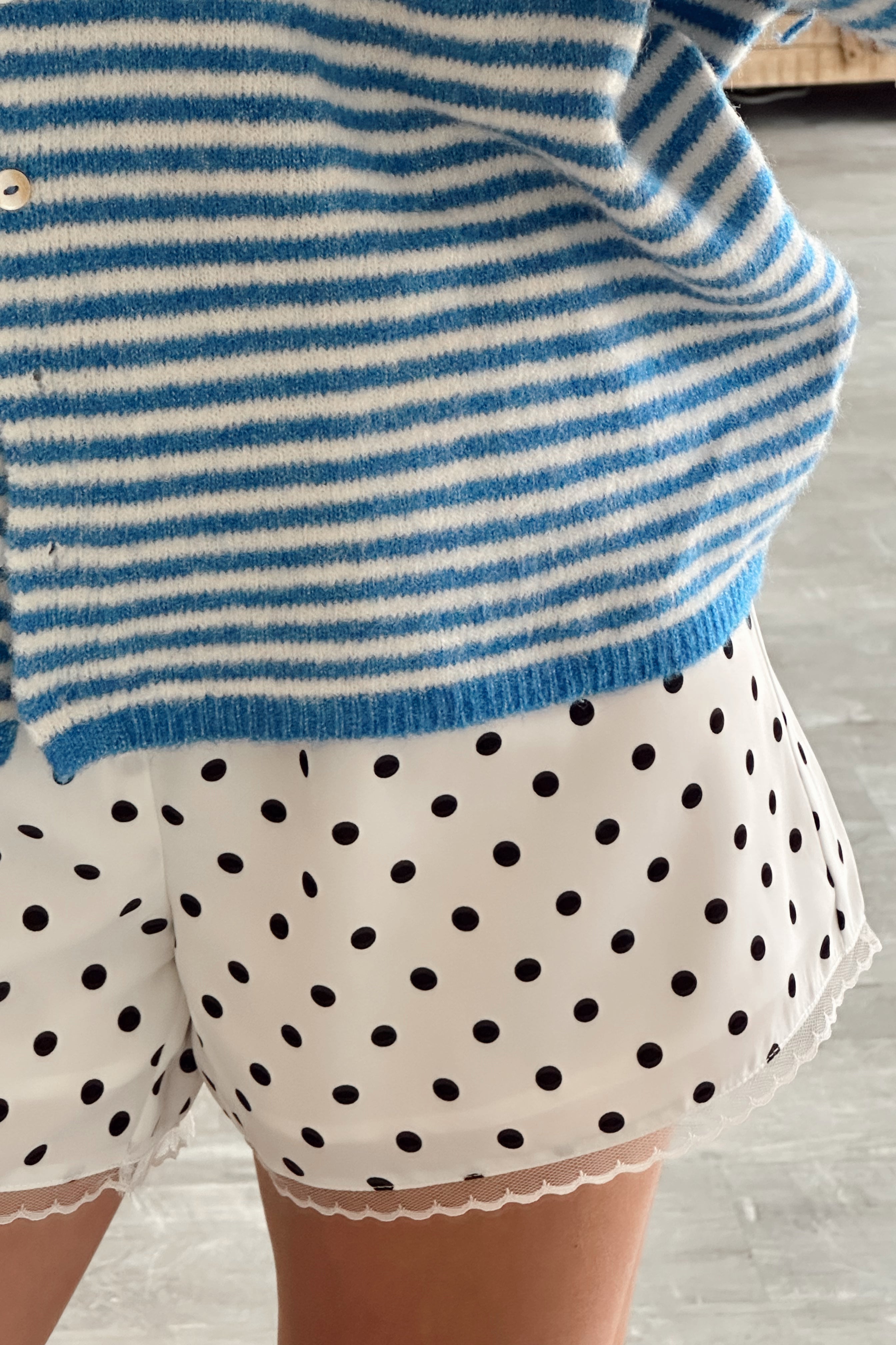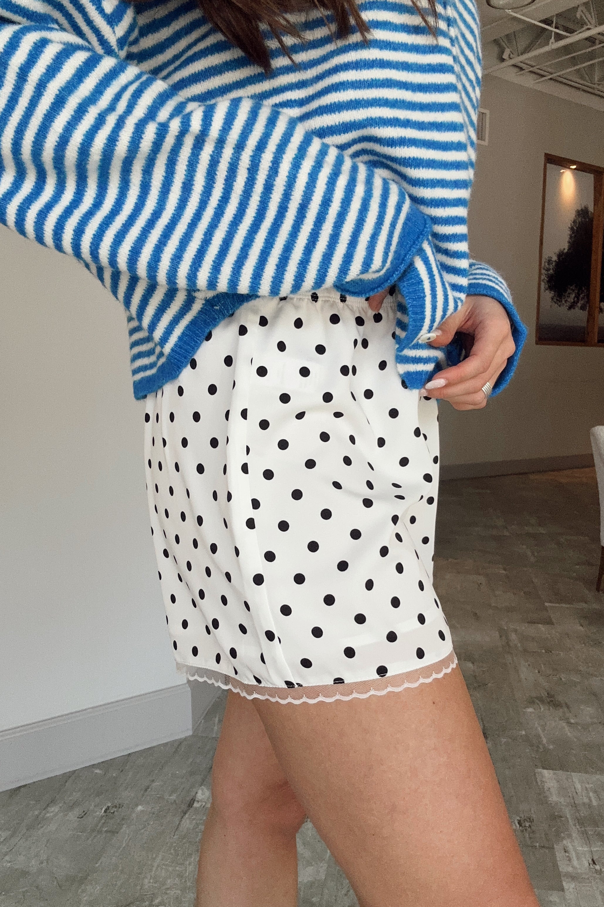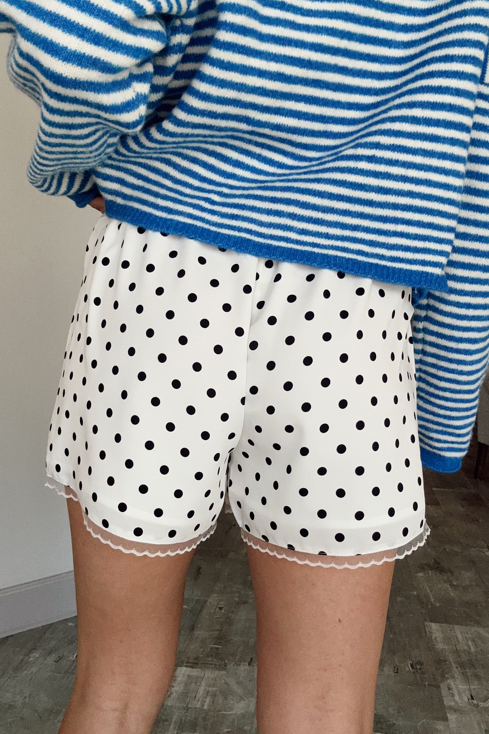The Gemma White & Black Polka Dot Shorts are playful, feminine, and perfect for warm-weather styling. Crafted from lightweight white fabric with a classic black polka dot print, these shorts feel fresh and timeless. Delicate lace trim details add a soft, romantic touch that elevates the look beyond a simple everyday style.