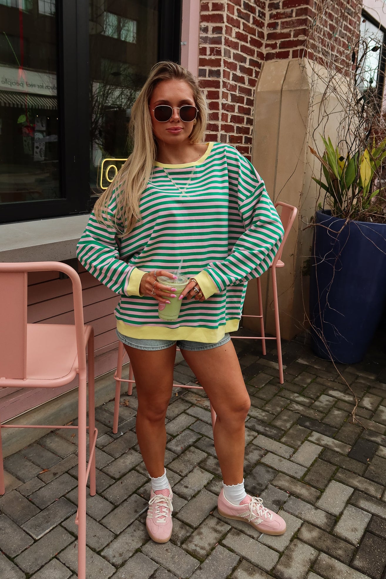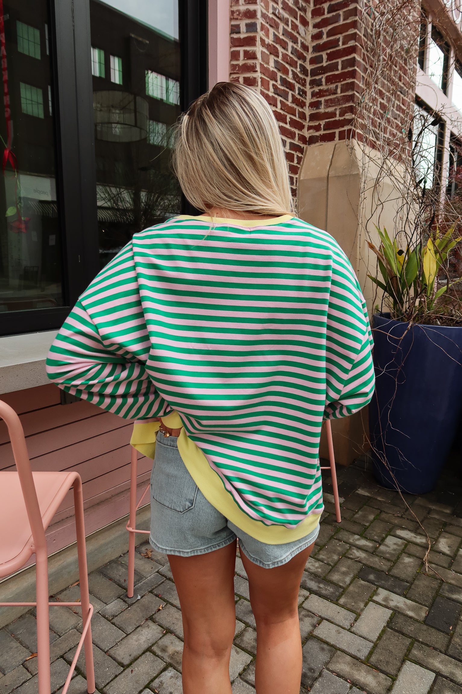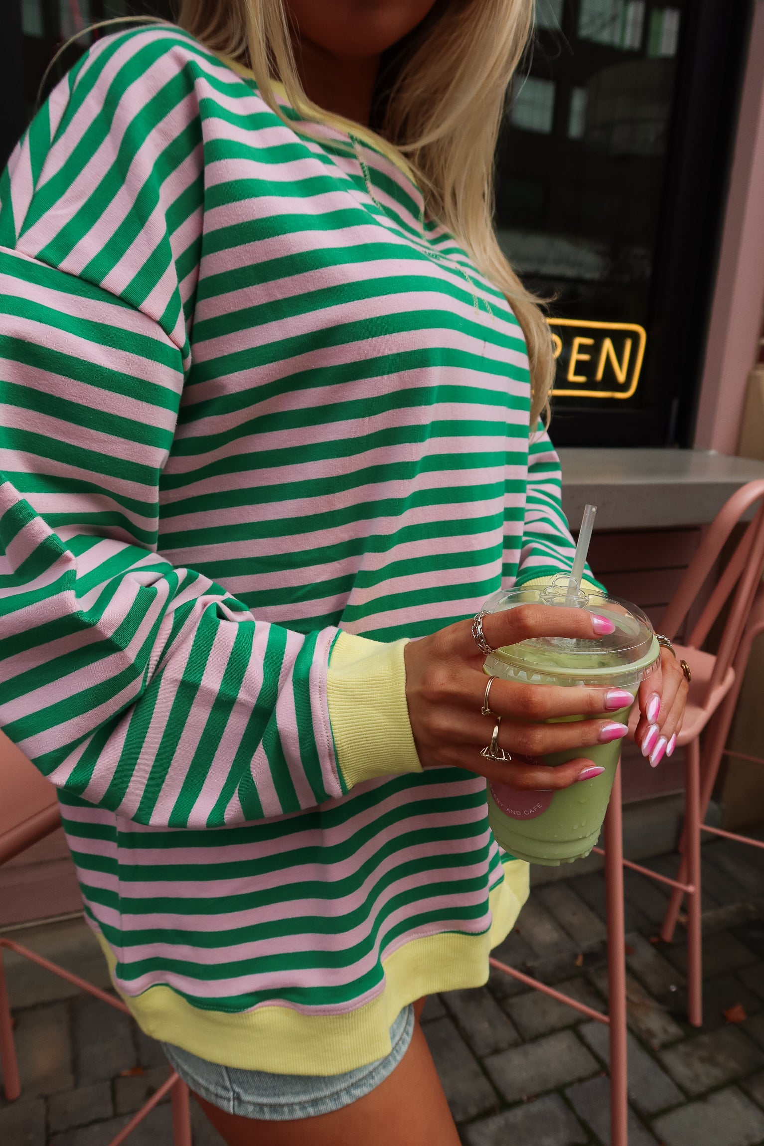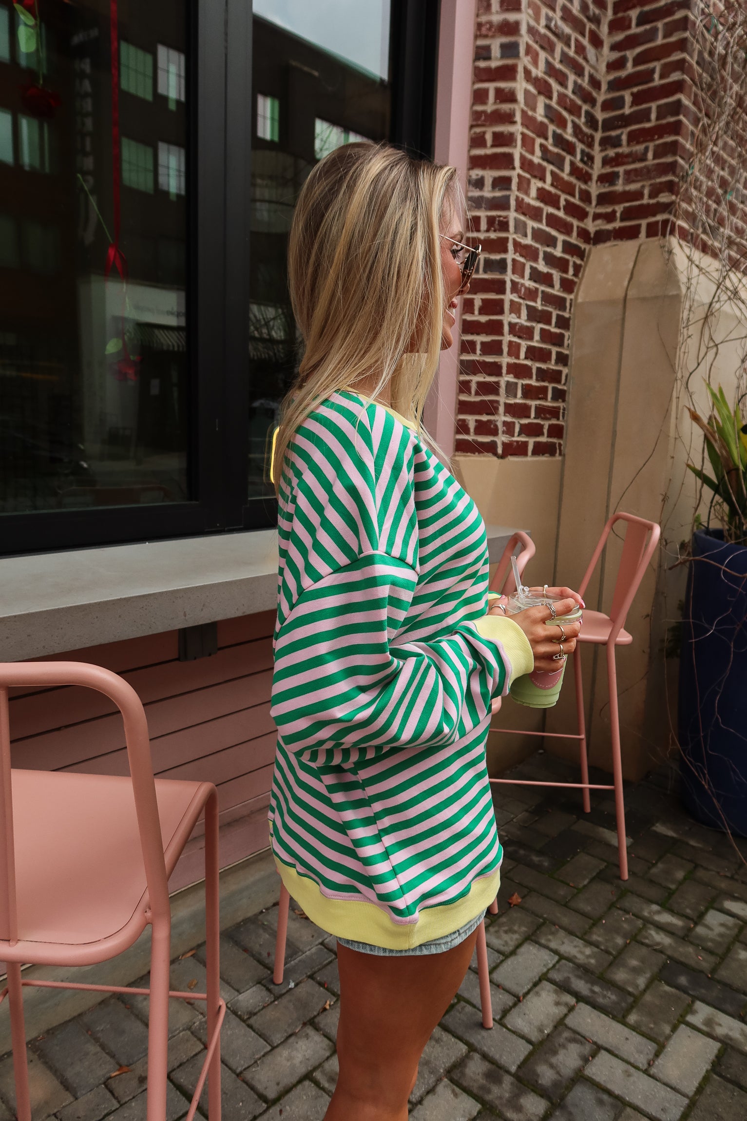 The Taylor Green & Pink Multi Stripe Pullover brings playful color and effortless personality to your everyday wardrobe. Crafted from lightweight, breathable knit fabric, this pullover features vibrant green and pink stripes that instantly brighten simple outfits. The soft material allows comfortable movement throughout the day, while the classic round neckline keeps the look timeless and easy to style.