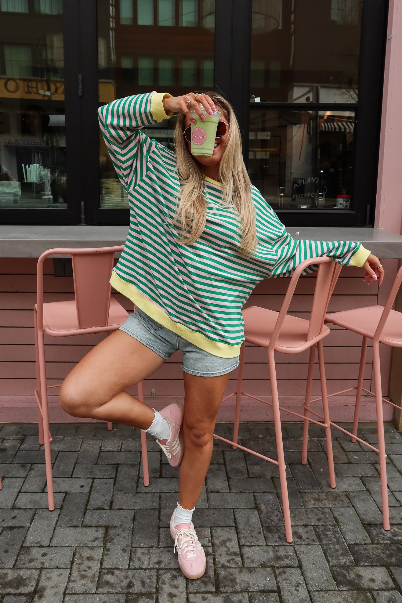 A pale yellow ribbed hem adds subtle contrast and gentle structure, giving the silhouette a polished finish. Long sleeves provide light coverage, making it perfect for transitional weather and layering. Pair it with denim and sneakers for relaxed weekends or style it with tailored shorts or midi skirts for a fresh, modern twist. Fun yet versatile, this striped pullover is an easy go-to for adding color to everyday looks.