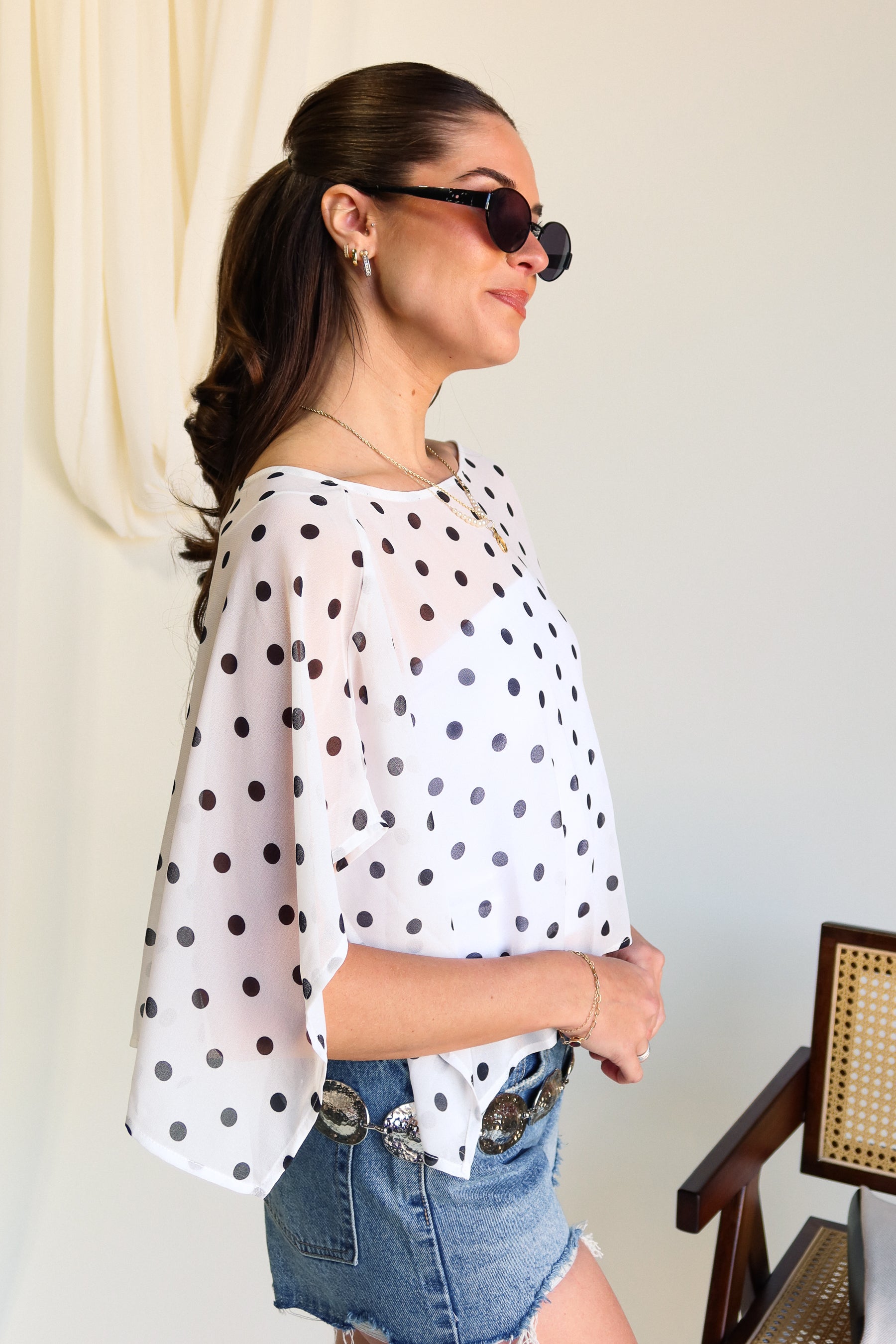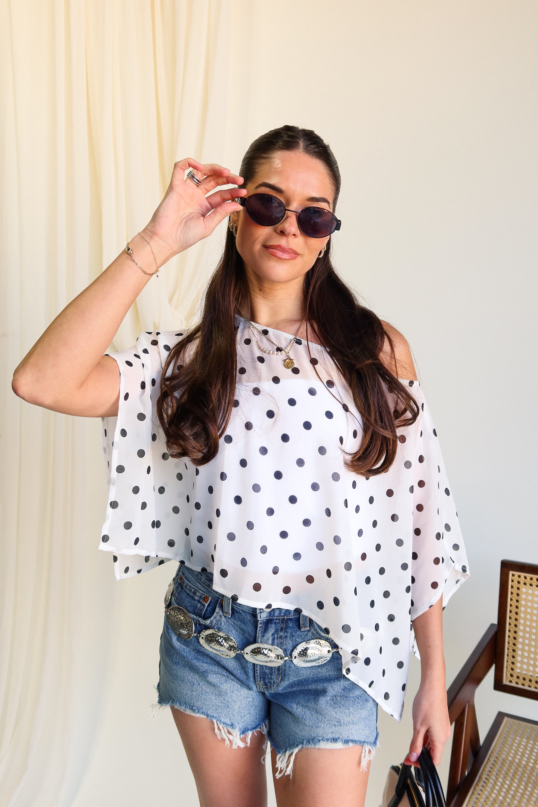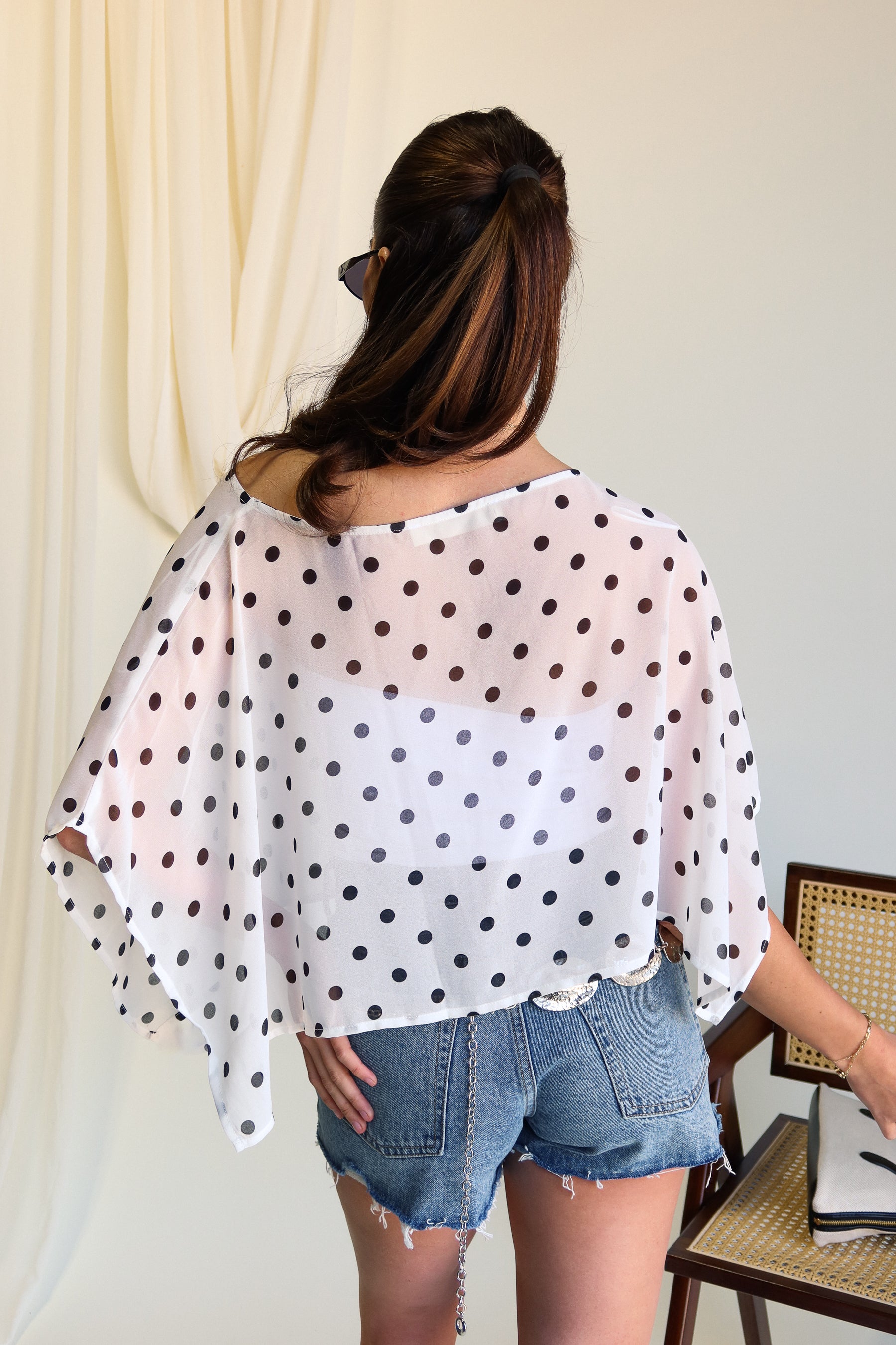 Add a playful statement to your wardrobe with the Elisa White & Black Polka Dot Poncho Top, a chic blend of classic print and modern silhouette.