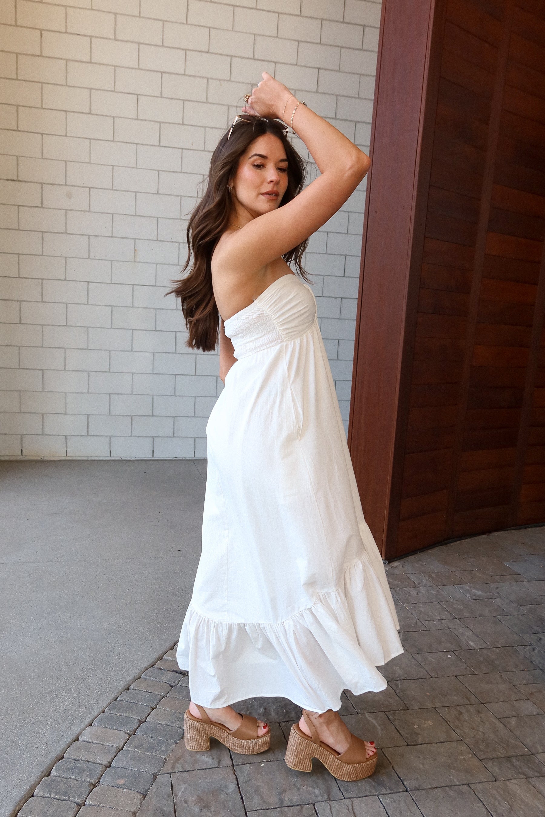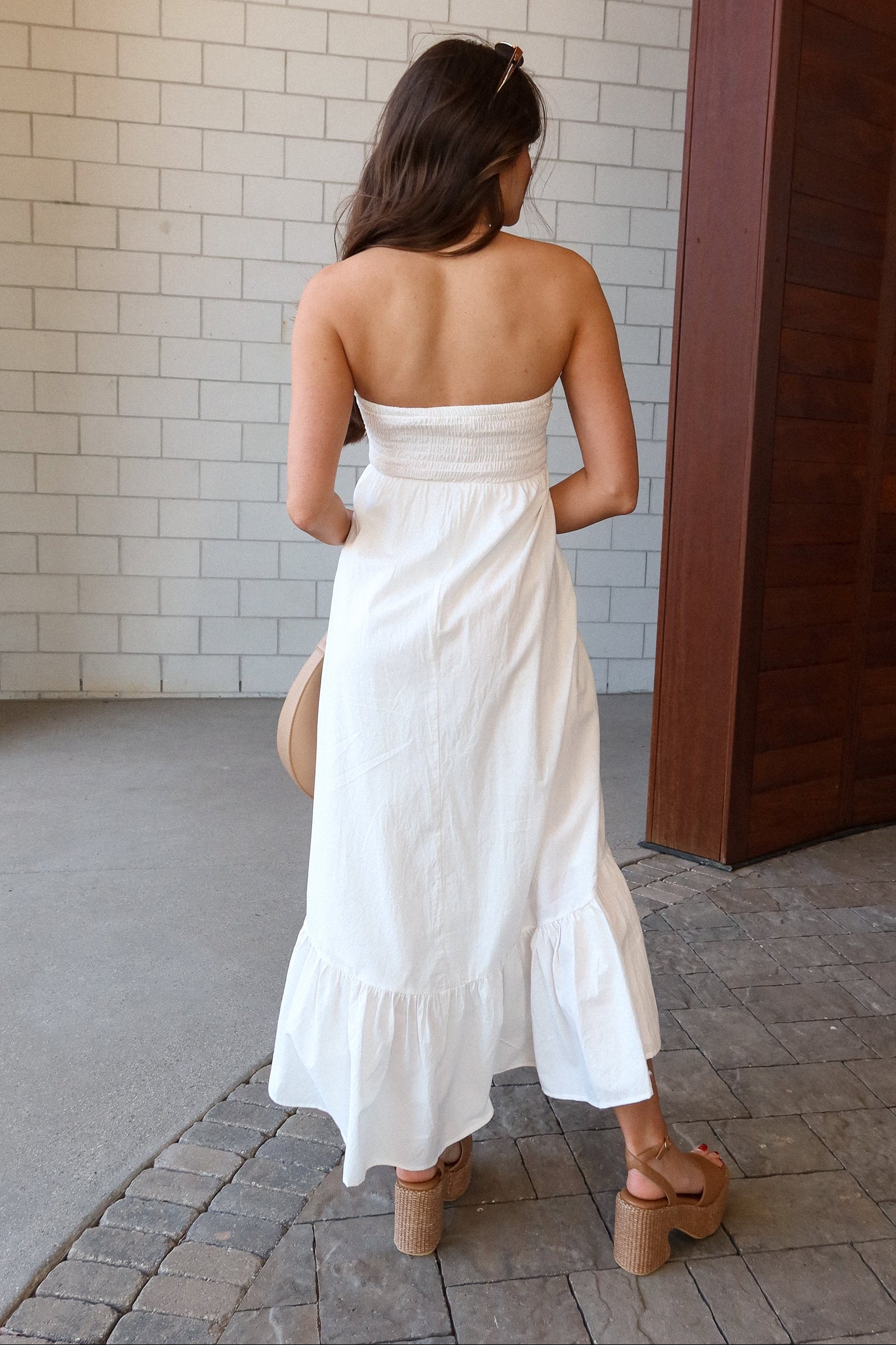 A smocked back provides flexible comfort, while the midi length and flare ruffled hem add graceful movement with every step. Perfect for showers, brunch, vacations, or special occasions, the Celia dress pairs beautifully with sandals or heels for a timeless, elegant outfit.