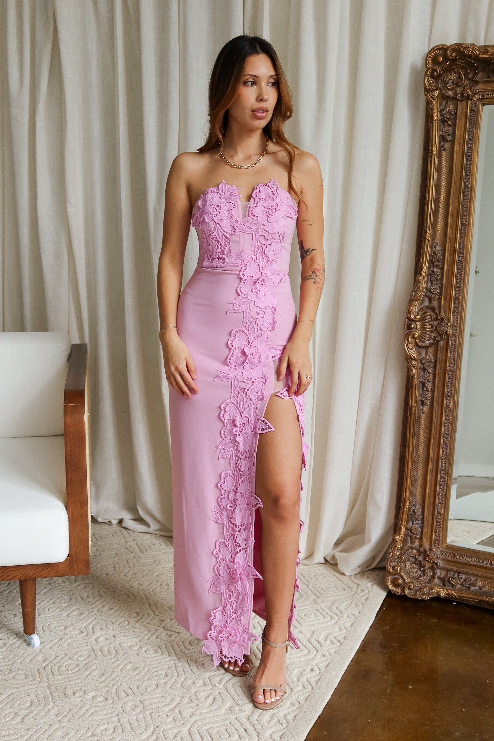 Elisa Pink Lace Floral Slit Maxi Dress
