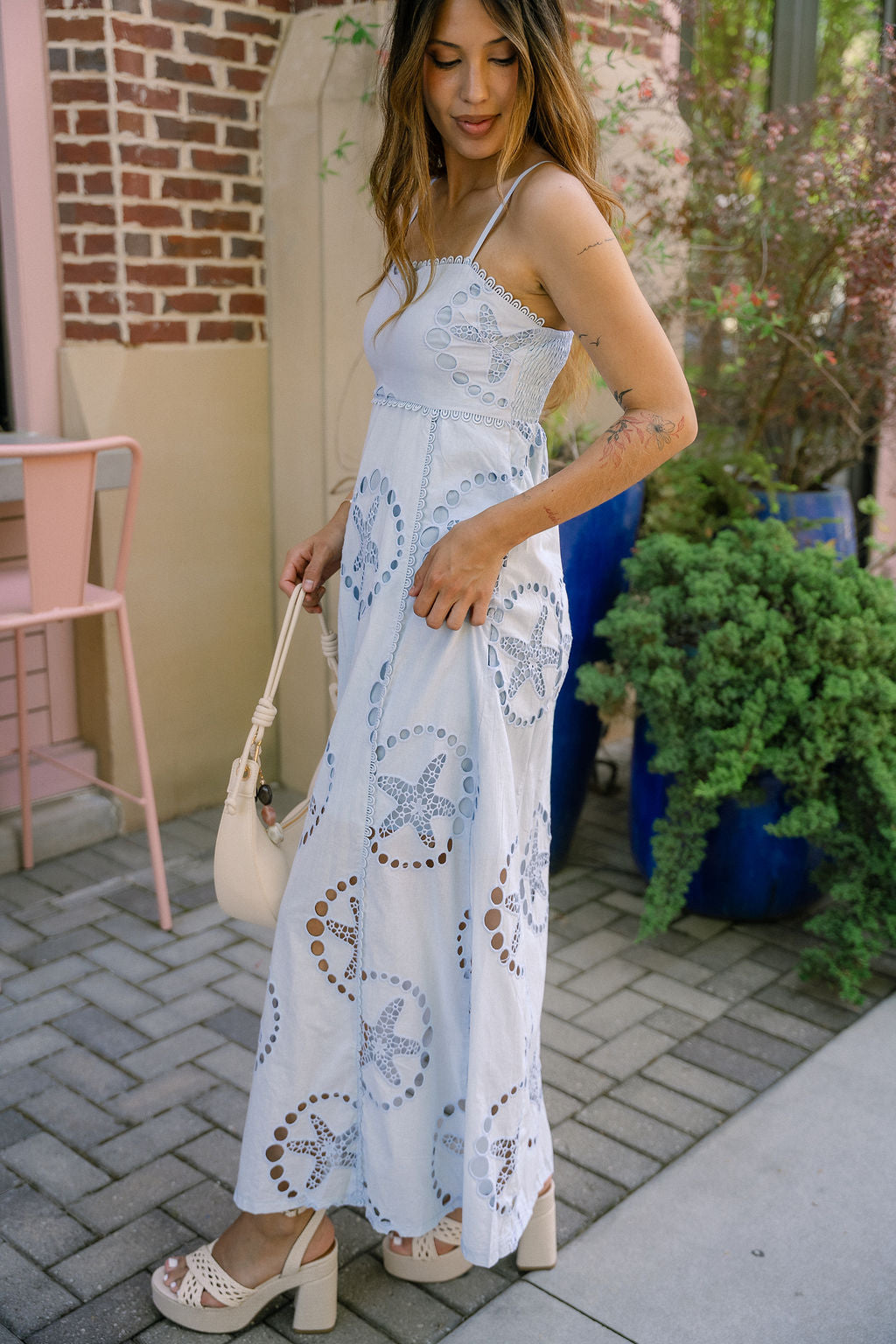 Gracelyn Light Blue Seashell Eyelet Midi Dress