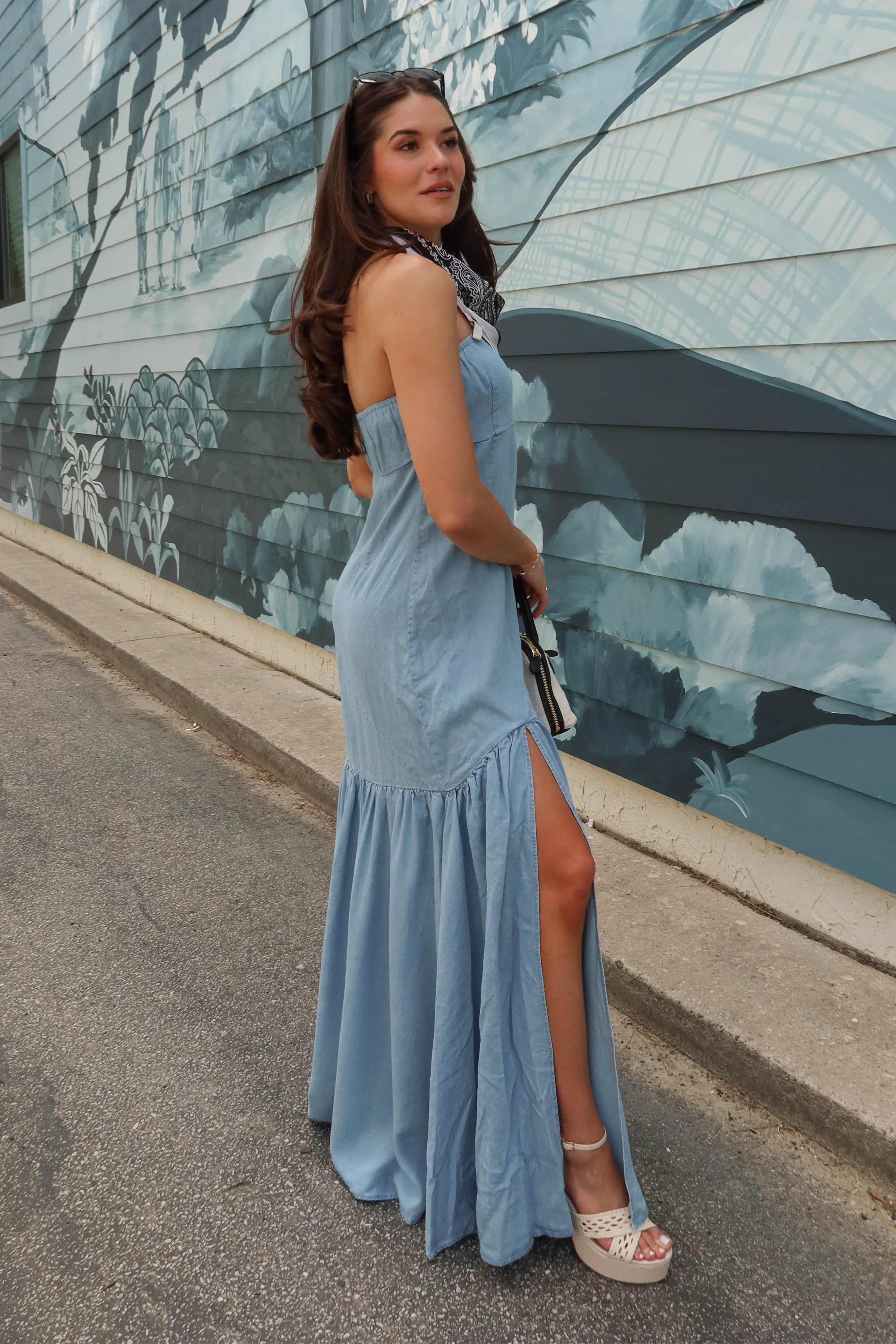 The Greer Chambray Strapless Maxi Dress is a chic, easygoing style with a modern silhouette. Made from light chambray lightweight fabric, it offers a soft, breathable feel that is perfect for warm weather. The strapless neckline creates a clean, flattering look that highlights the shoulders.