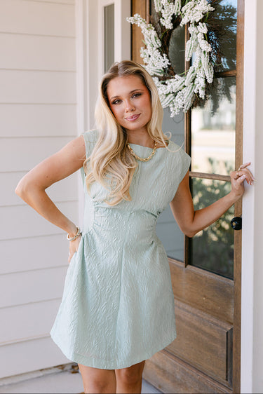 The Jane Sage dress pairs beautifully with heels or flats for an effortlessly polished outfit. With its blend of elegant fabric, flattering details, and modern mini length, the Jane Sage Jacquard Floral Mini Dress brings refined charm and wearable sophistication to any occasion.