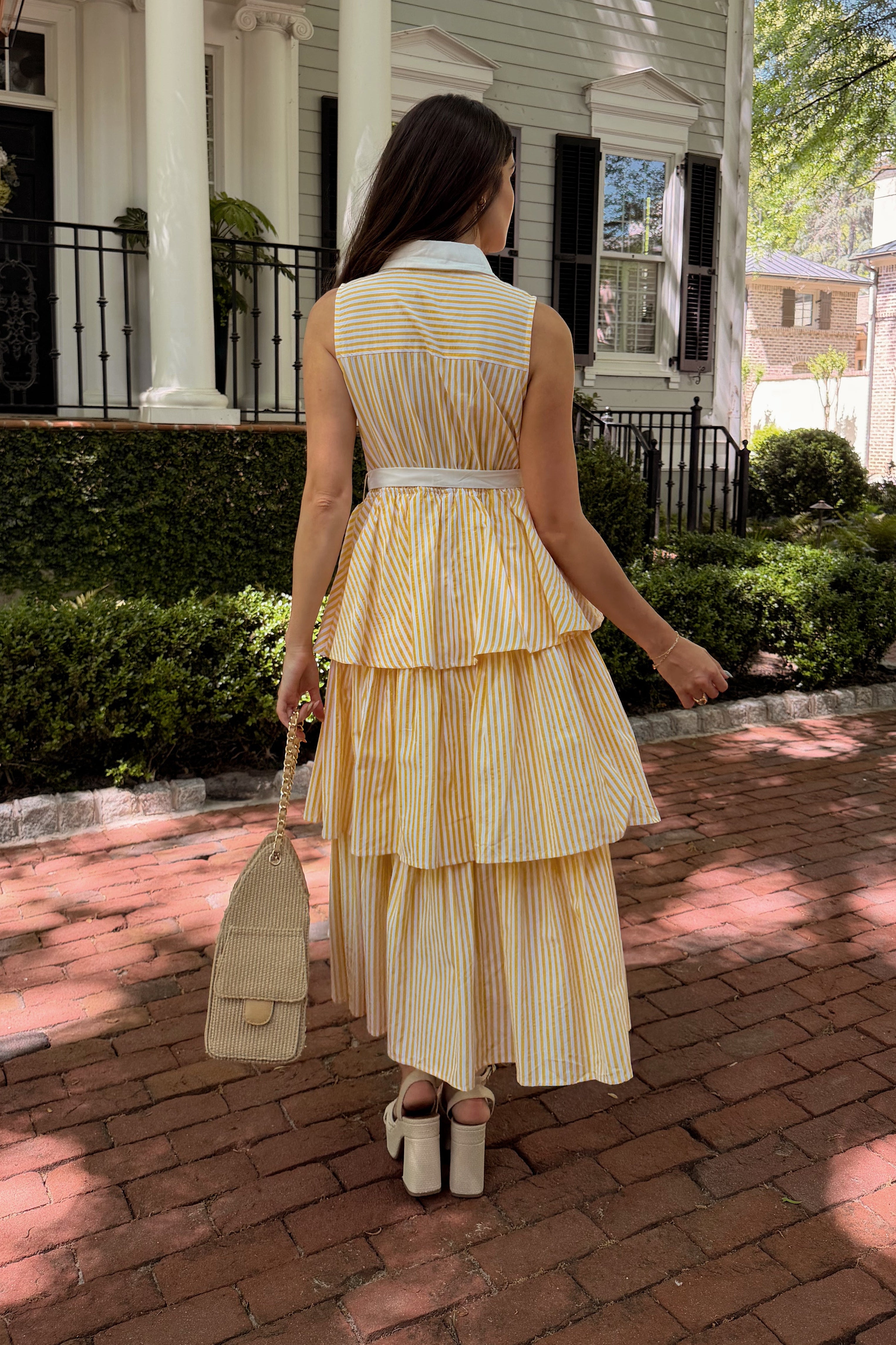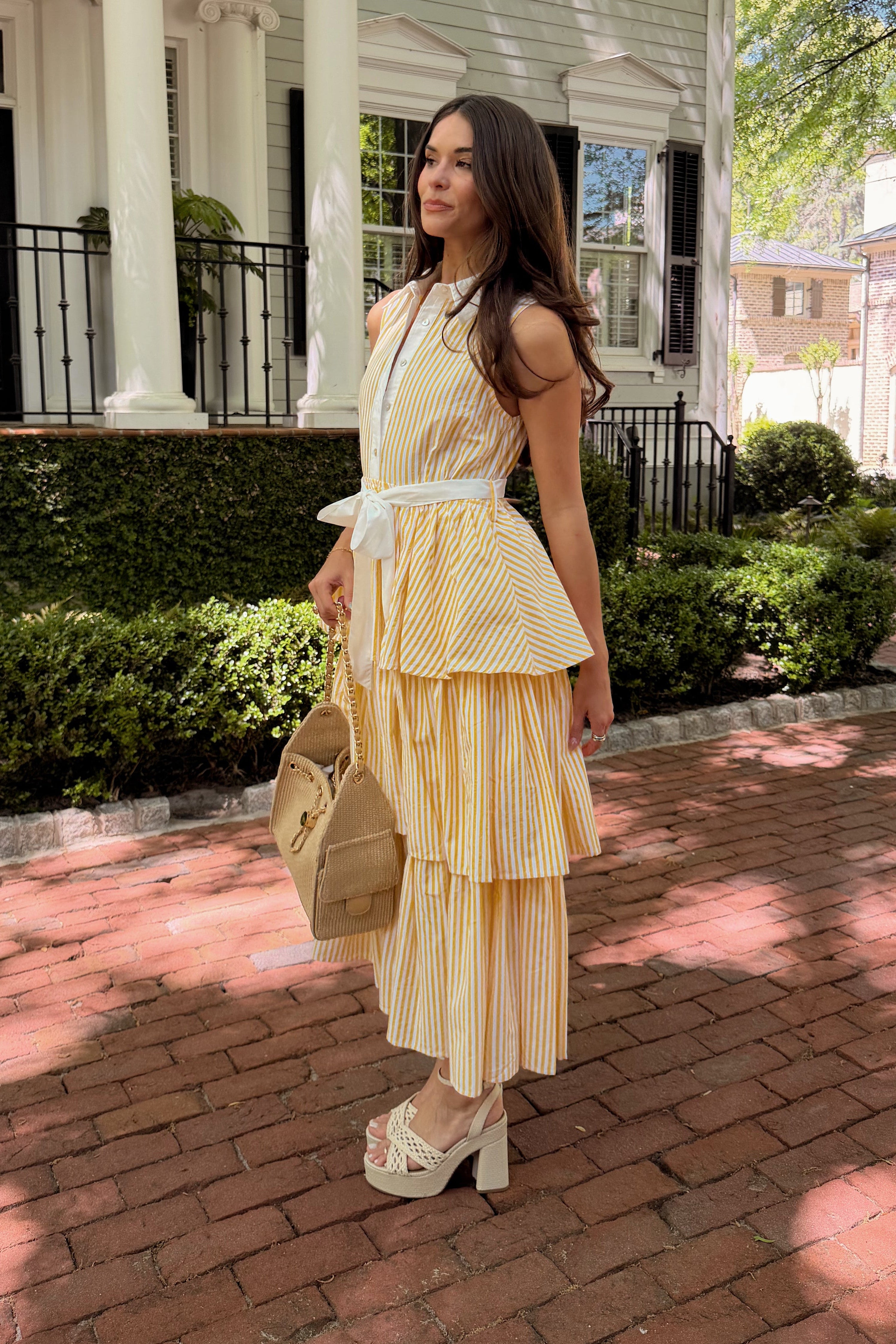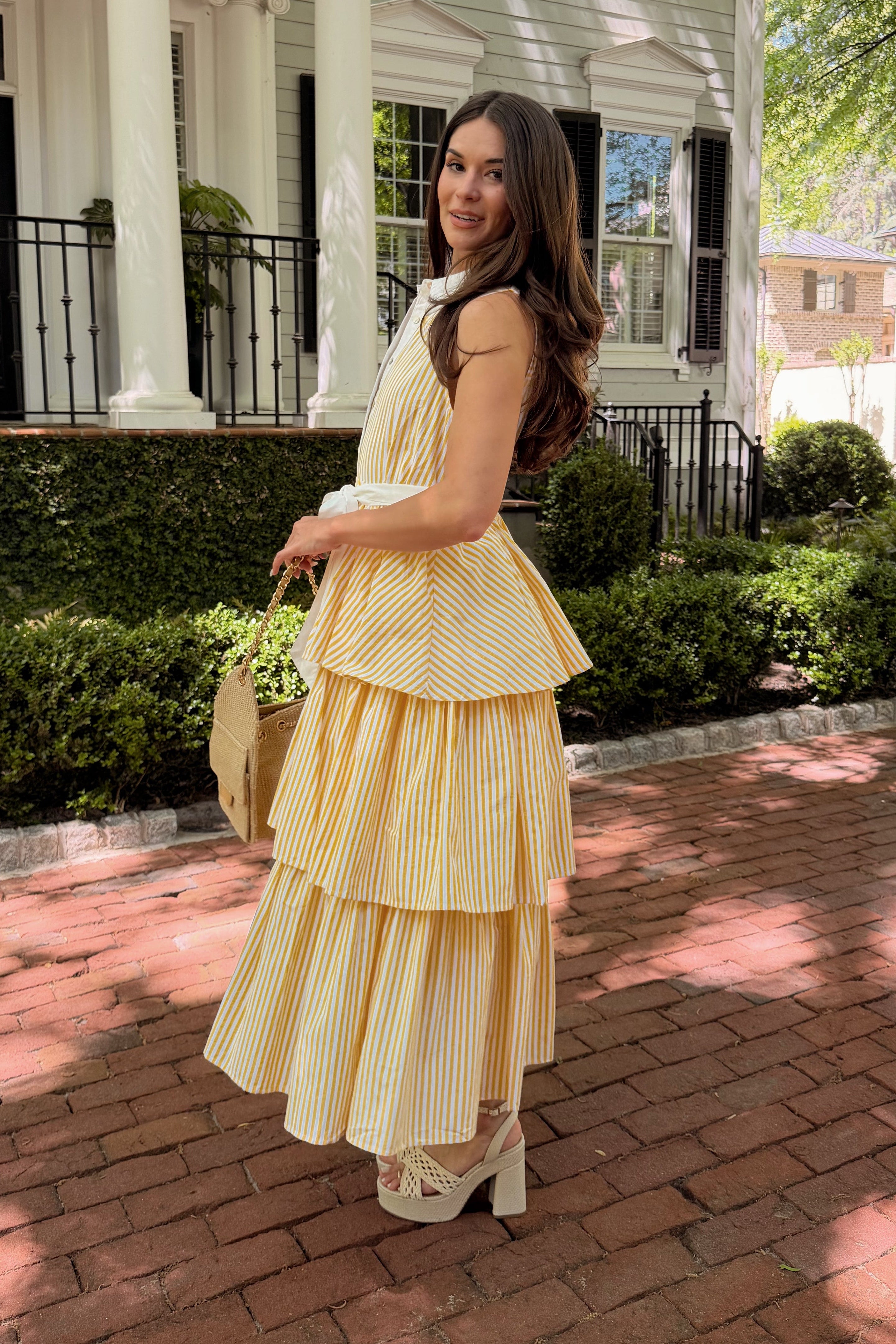 Bright, breezy, and effortlessly chic—the Solana Yellow & White Stripe Tiered Midi Dress is your go-to for sunny days and relaxed outings. Crafted from a lightweight fabric, this dress features a fresh yellow and white stripe print that feels both playful and timeless.