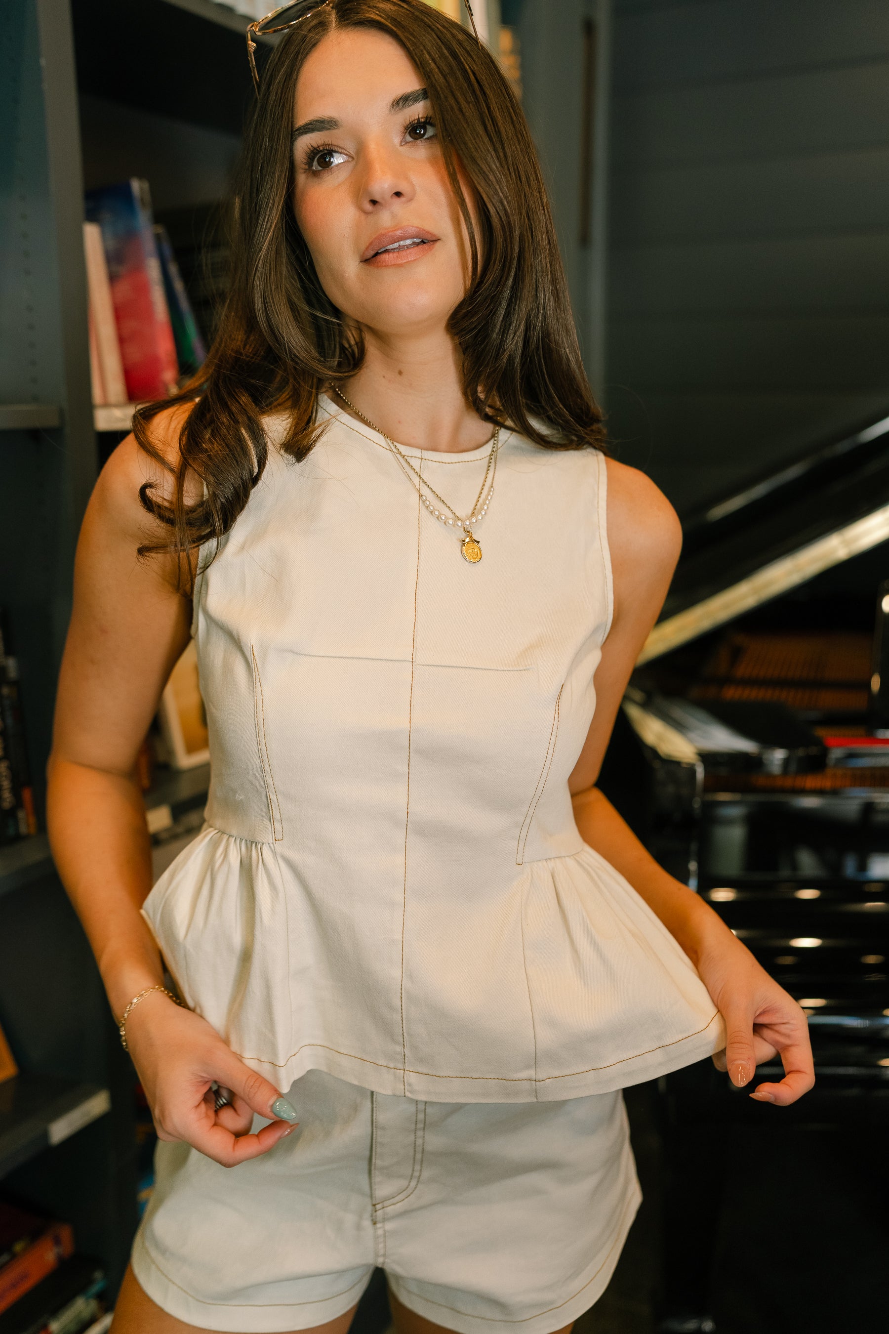 Soft, feminine, and effortlessly polished, the Magnolia Cream Flare Hem Tank is the kind of piece you’ll reach for all season long. Designed in a lightweight cream fabric, this top features subtle brown stitch detailing that adds just the right touch of contrast. The flattering flare hem creates an easy, flowy silhouette, while the round neckline keeps it classic and versatile.