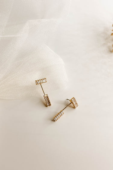 The So Easy Earrings features cluster of clear stones linked by a gold bar with another set of clear stones.