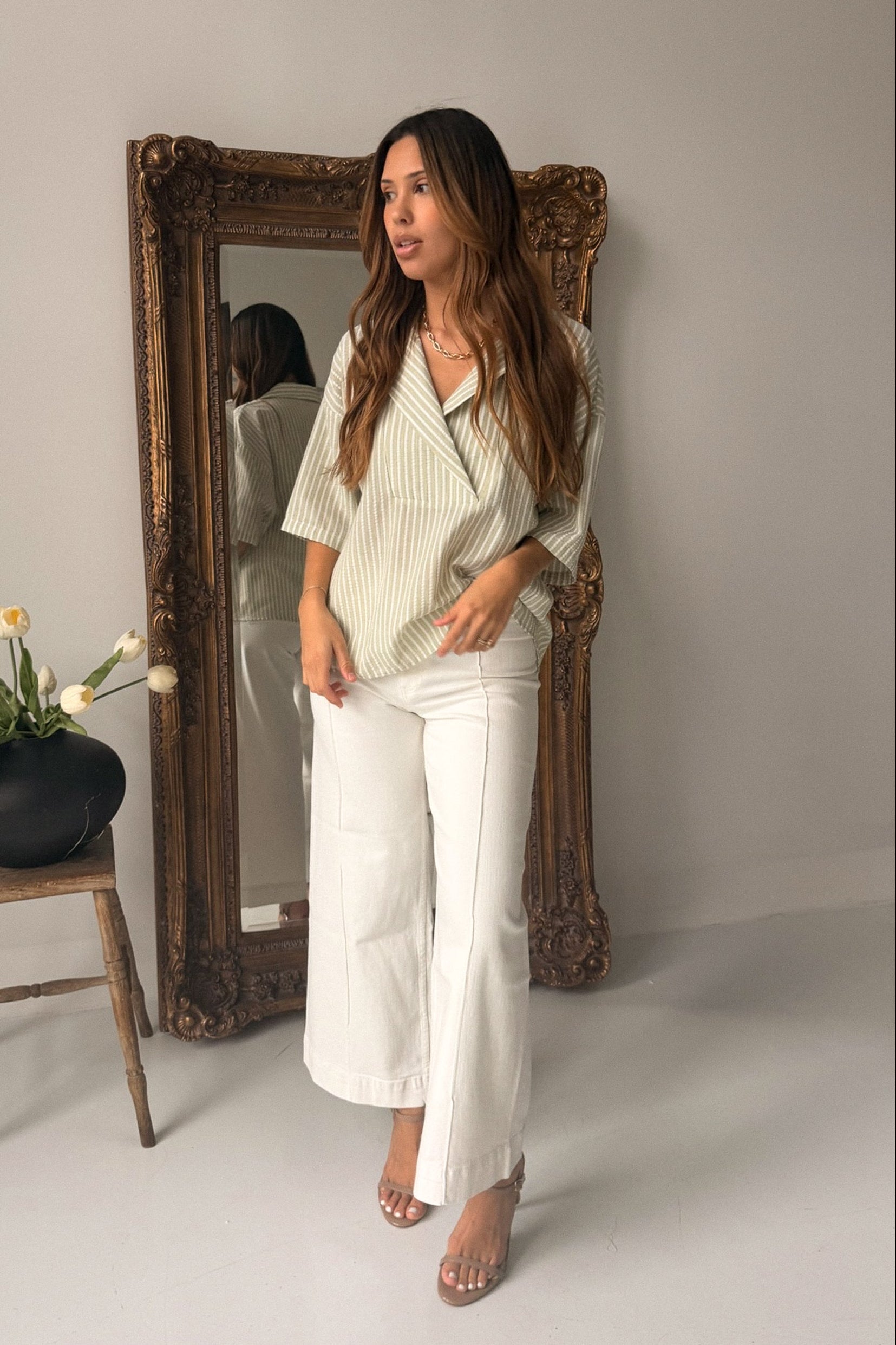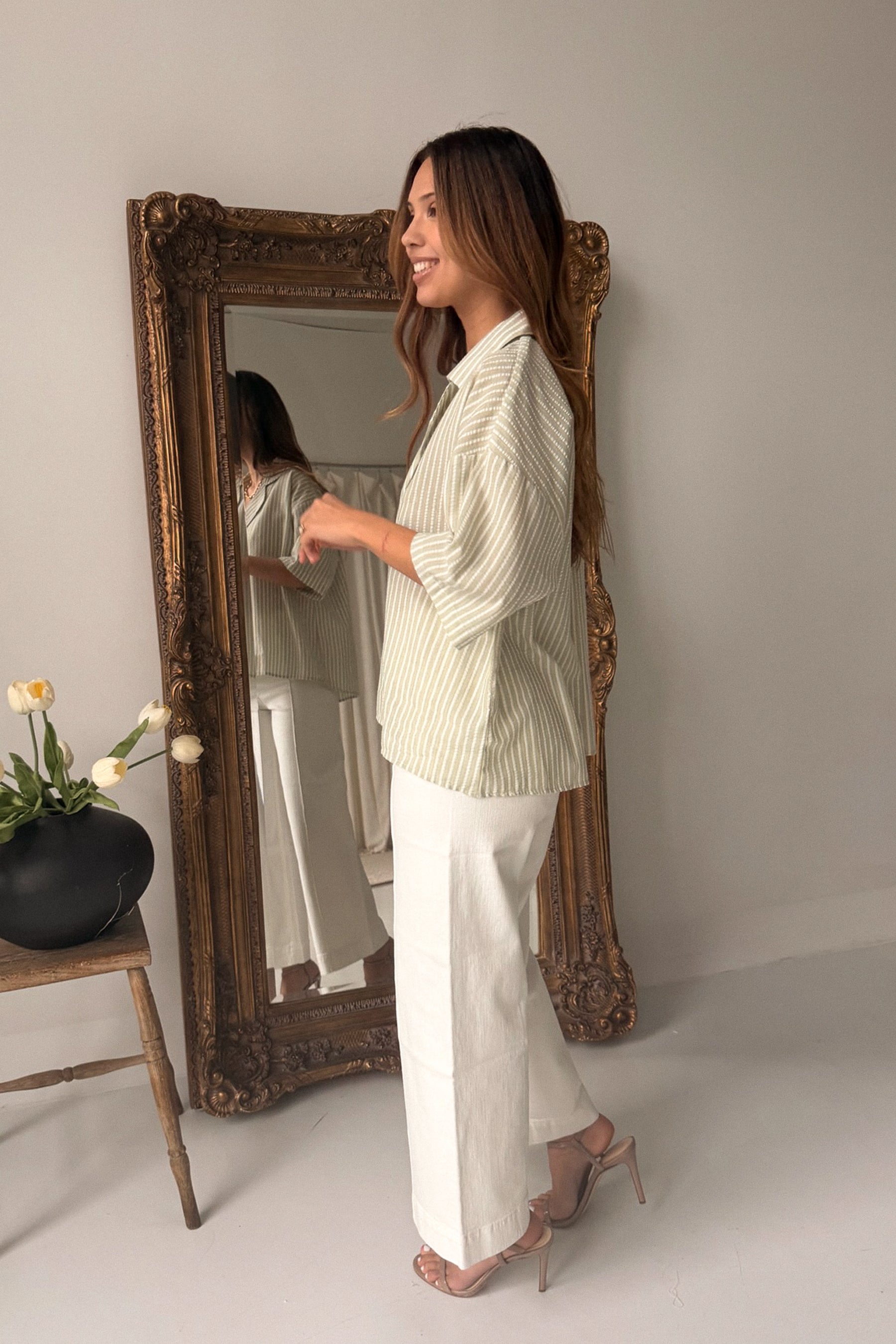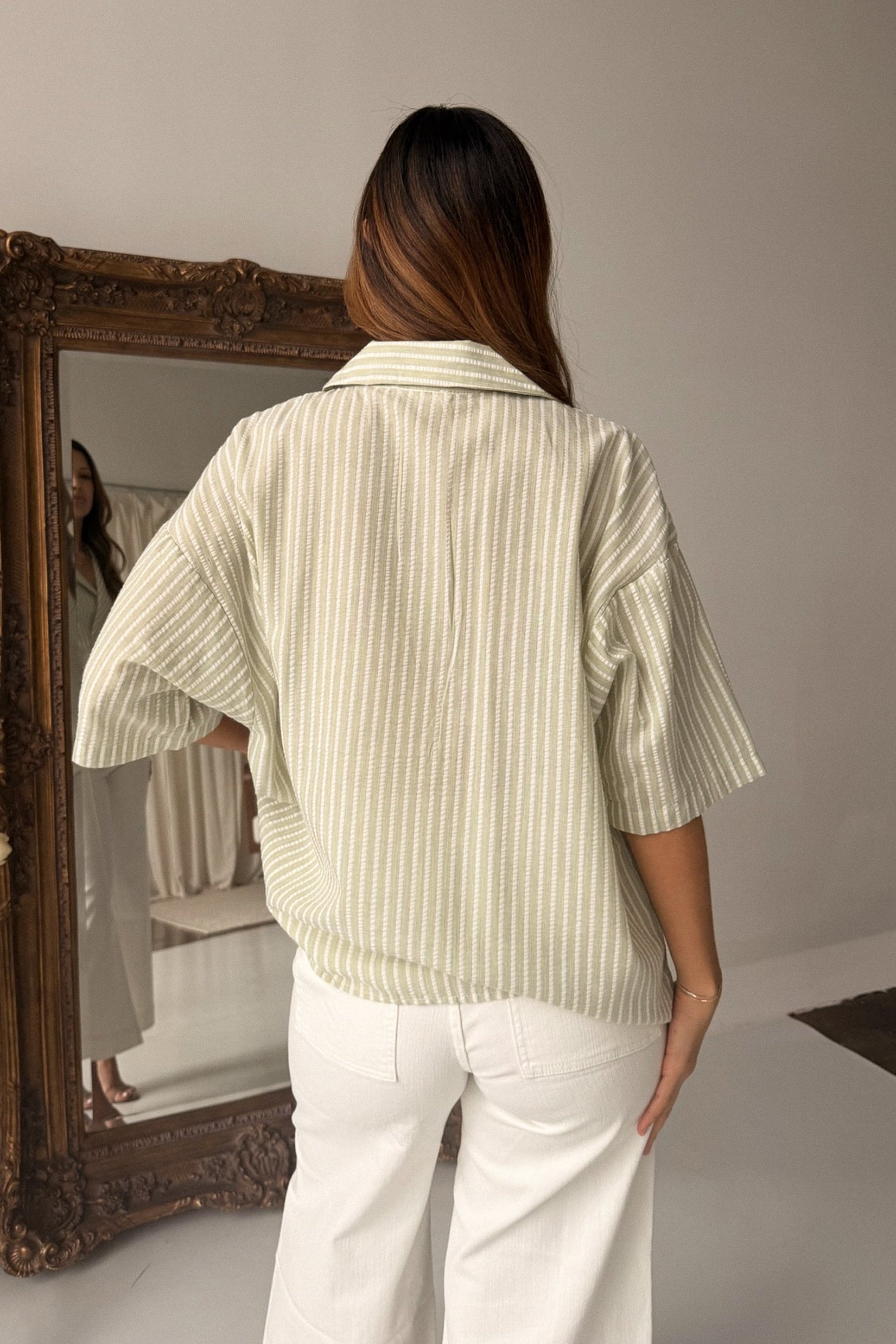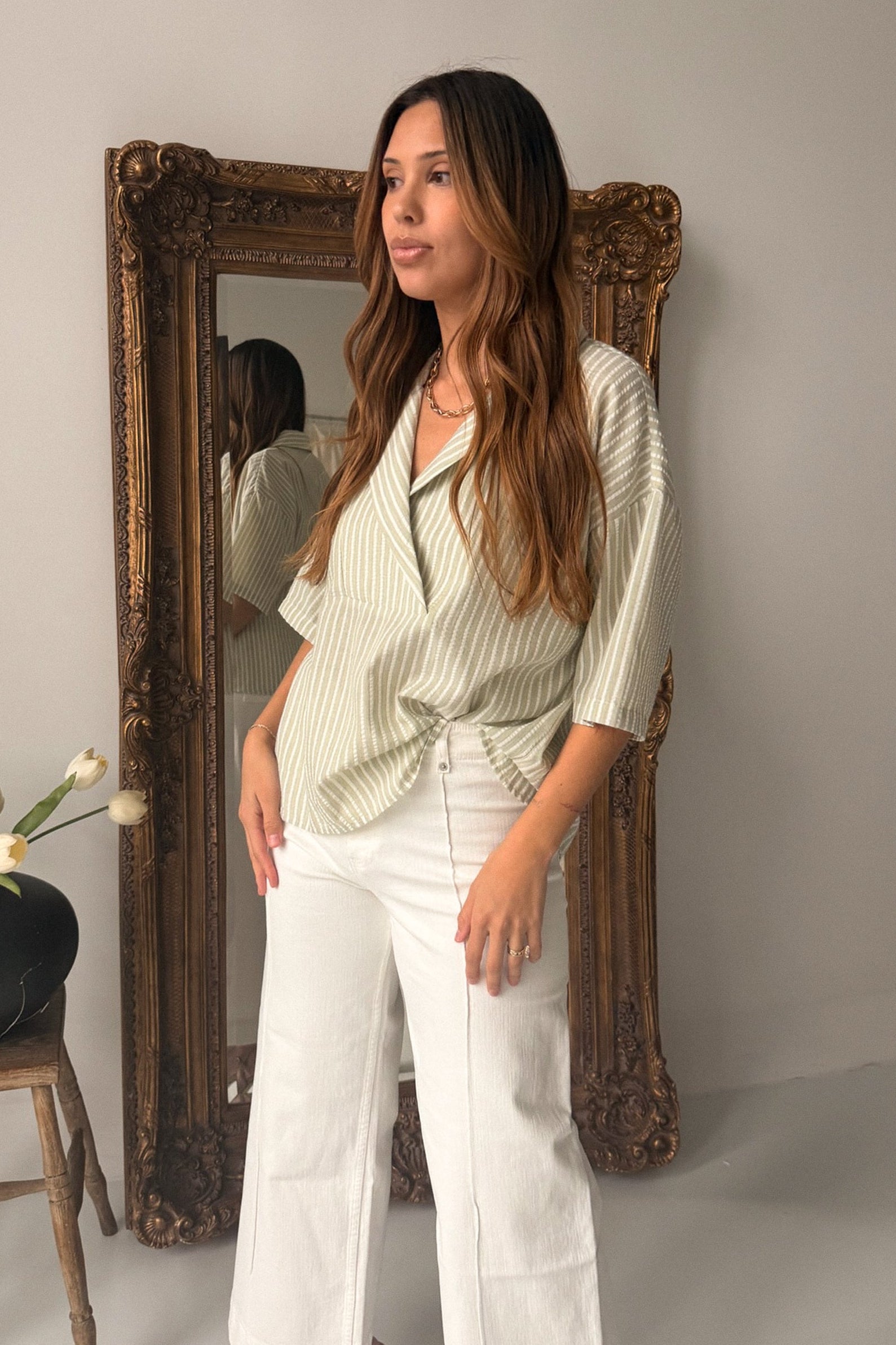 The Veronica Sage & White Striped Top offers a fresh, polished look with effortless versatility. Crafted from lightweight sage and white fabric, this top features a timeless stripe print that feels both relaxed and refined. The V-neckline with collar detail adds structure and a tailored touch, elevating the classic silhouette.