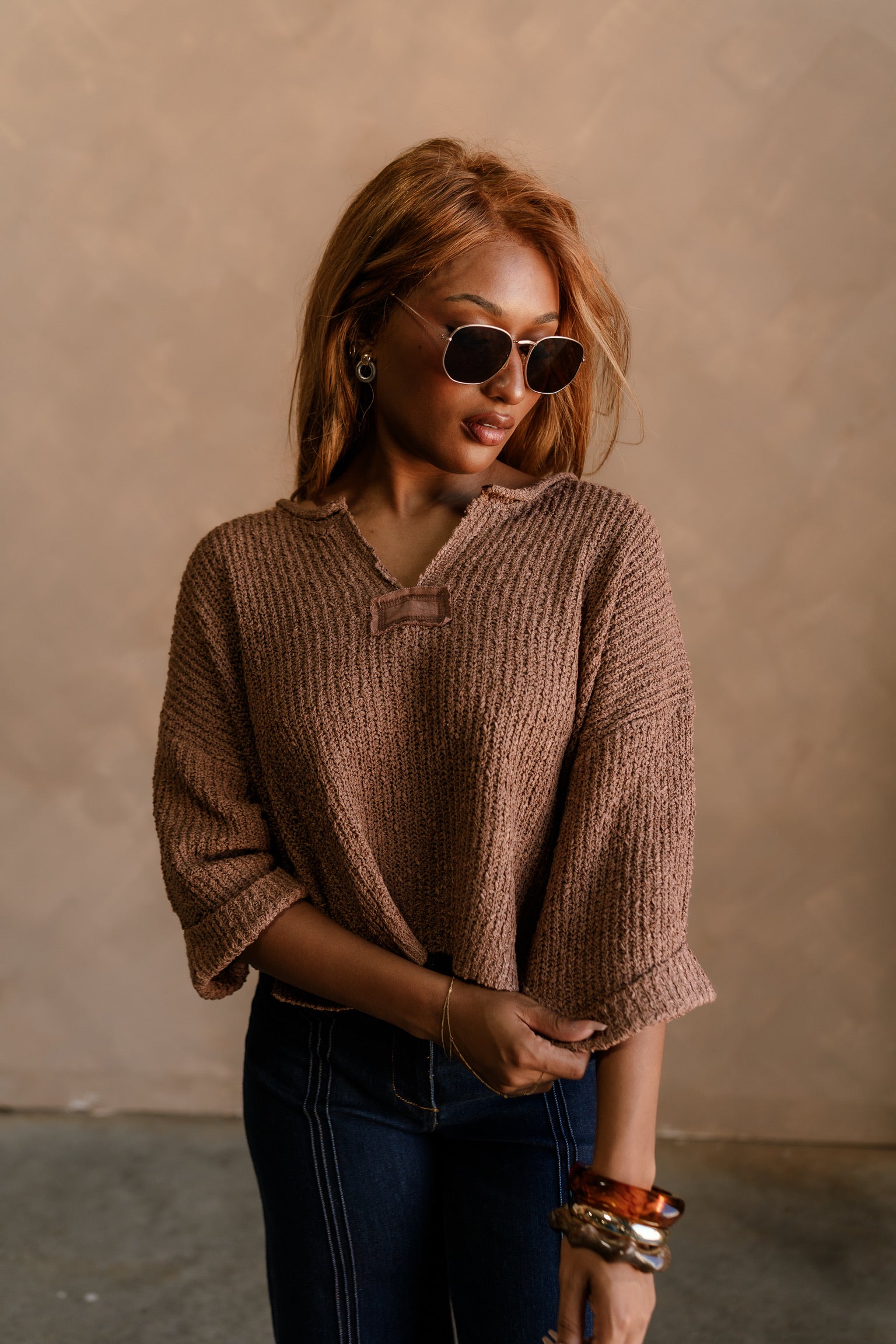 Belinda Gold & Rhinestone Earrings - close up side view on model
