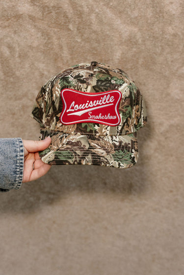 The Louisville Smokeshow Camo Trucker Hat blends laid-back style with a bold touch of Kentucky pride. Designed in a classic camo print, this hat features a curved bill and a bright red “Louisville Smokeshow” seal logo embroidered on the front for a pop of color and personality. It’s the perfect accessory for game days, weekends on the go, or casual outdoor adventures.