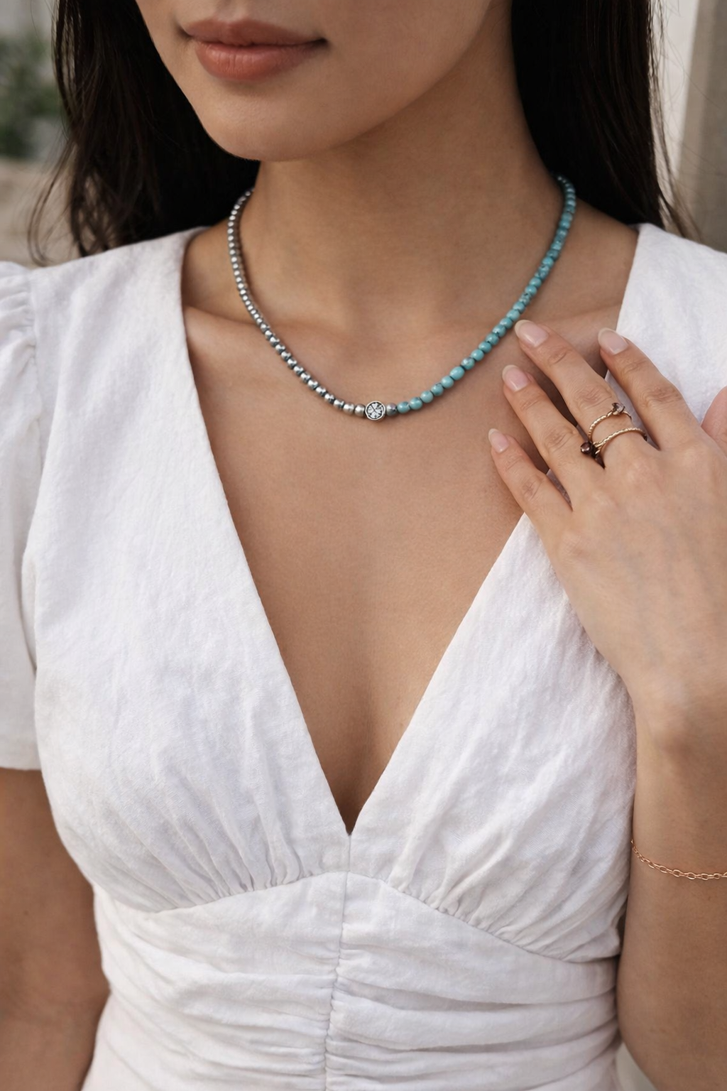 Turquoise beads on the opposite side