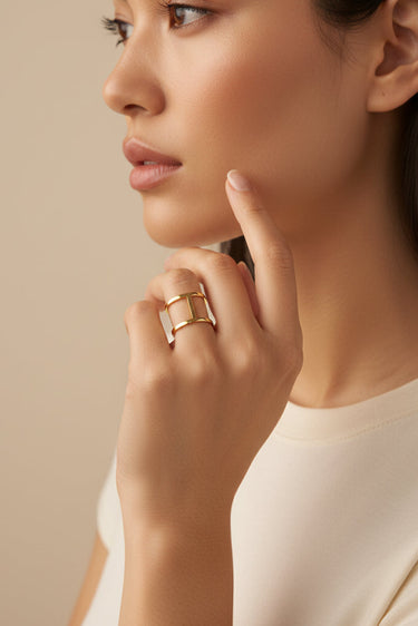 The Calista Gold Bar Ring is a modern and elegant accessory designed to elevate any outfit. Featuring a double gold band connected by a sleek gold bar, this ring creates a unique, contemporary look that’s both stylish and versatile. Its minimalist design makes it perfect for stacking or wearing alone as a standout piece.