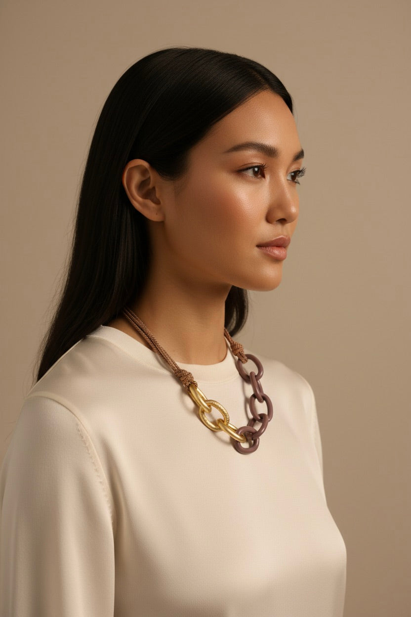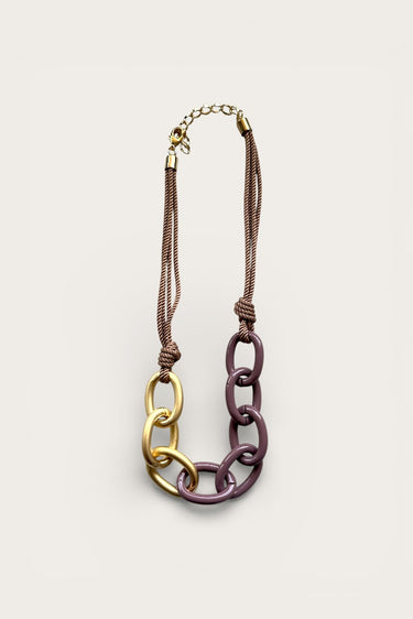 Elegant with a modern edge, the Claire Mauve & Brushed Gold Chain Necklace is a statement accessory designed to elevate any look. Featuring a mix of mauve and brushed gold chains, this necklace creates beautiful contrast and rich texture for a refined yet eye-catching finish. Rope-inspired detailing adds dimension and a touch of artisanal charm, while the adjustable link closure allows for a customizable fit and versatile styling. Perfect for layering or wearing solo, the Claire necklace pairs effortlessly with casual outfits and dressier ensembles alike. With its unique blend of soft color, metallic shine, and thoughtful detailing, the Claire Mauve & Brushed Gold Chain Necklace adds polished sophistication and timeless style to any jewelry collection.