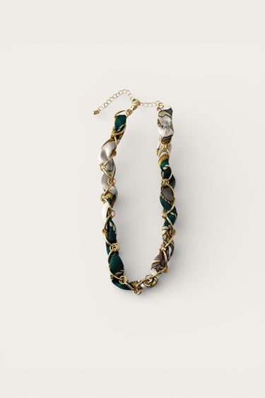 Bold, versatile, and effortlessly chic, the Vivian Green Multi Scarf & Gold Chain Necklace is a statement accessory that elevates any outfit. This unique piece features a sleek gold chain intertwined with a lightweight scarf in shades of green, grey, brown, and white, creating a dynamic, layered look with eye-catching movement. The printed scarf adds texture, color, and a touch of sophistication, making the necklace both playful and refined.