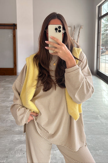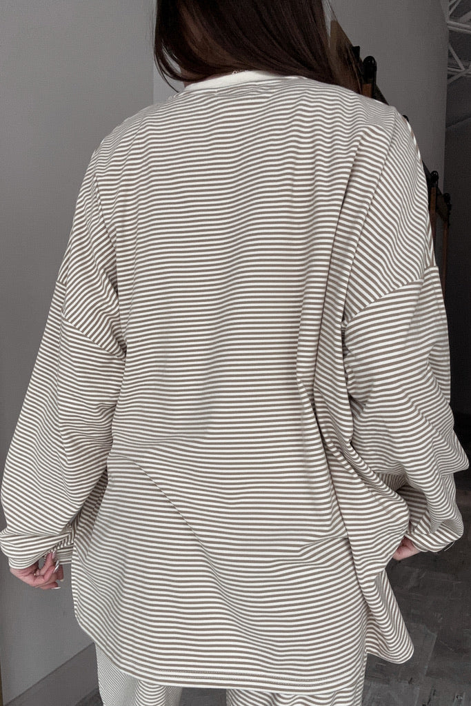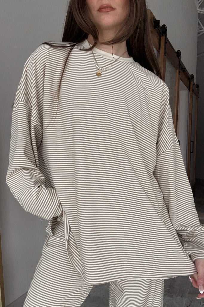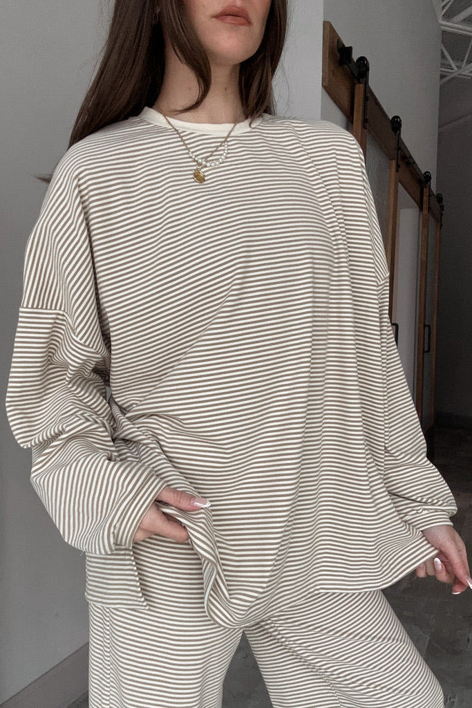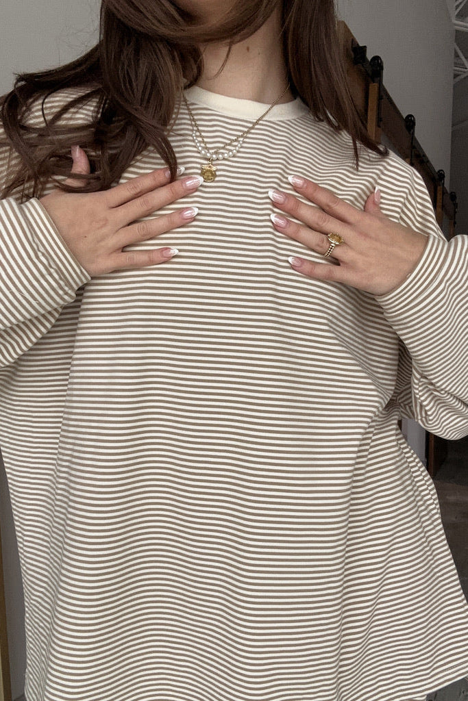 Soft, timeless, and easy to style, the Kellyn Beige Stripe Long Sleeve Top is an everyday essential with an elevated lounge feel. Crafted from ultra-soft knit fabric, this top features a neutral beige and cream stripe print that keeps the look classic and effortless. The round neckline creates a flattering, relaxed silhouette. The long sleeves offer comfortable coverage for transitional seasons and cozy days at home or on the go.