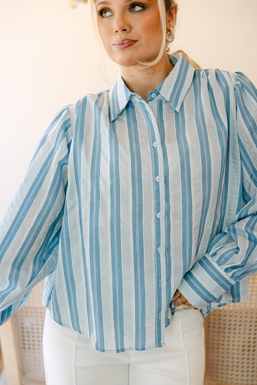 The Rowyn Blue Multi Stripe Button-Up Top blends classic tailoring with soft, feminine details. Crafted from a lightweight blue and light blue fabric, this top features a timeless stripe print accented by crisp white trim for a fresh, polished look.