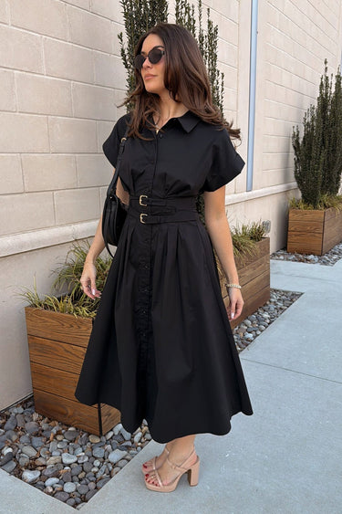 The Rachel Black Belt Flare Midi Dress is a timeless silhouette with polished, feminine details. Crafted from lightweight black fabric with a smooth black lining, this midi dress offers effortless comfort and elegant movement. The front button up design is complemented by a pleated upper that adds subtle texture, while the adjustable belt cinches the waist for a flattering fit.