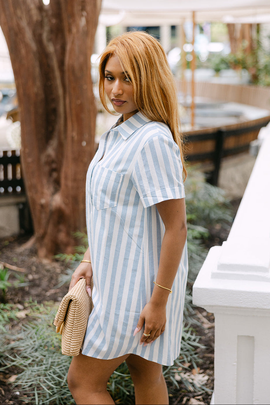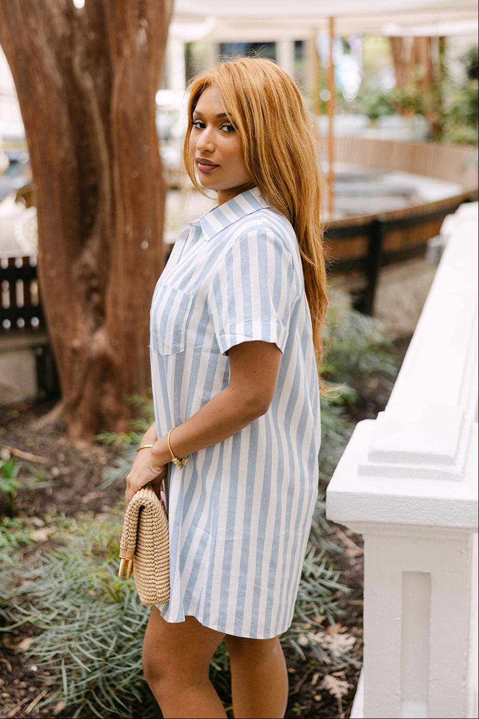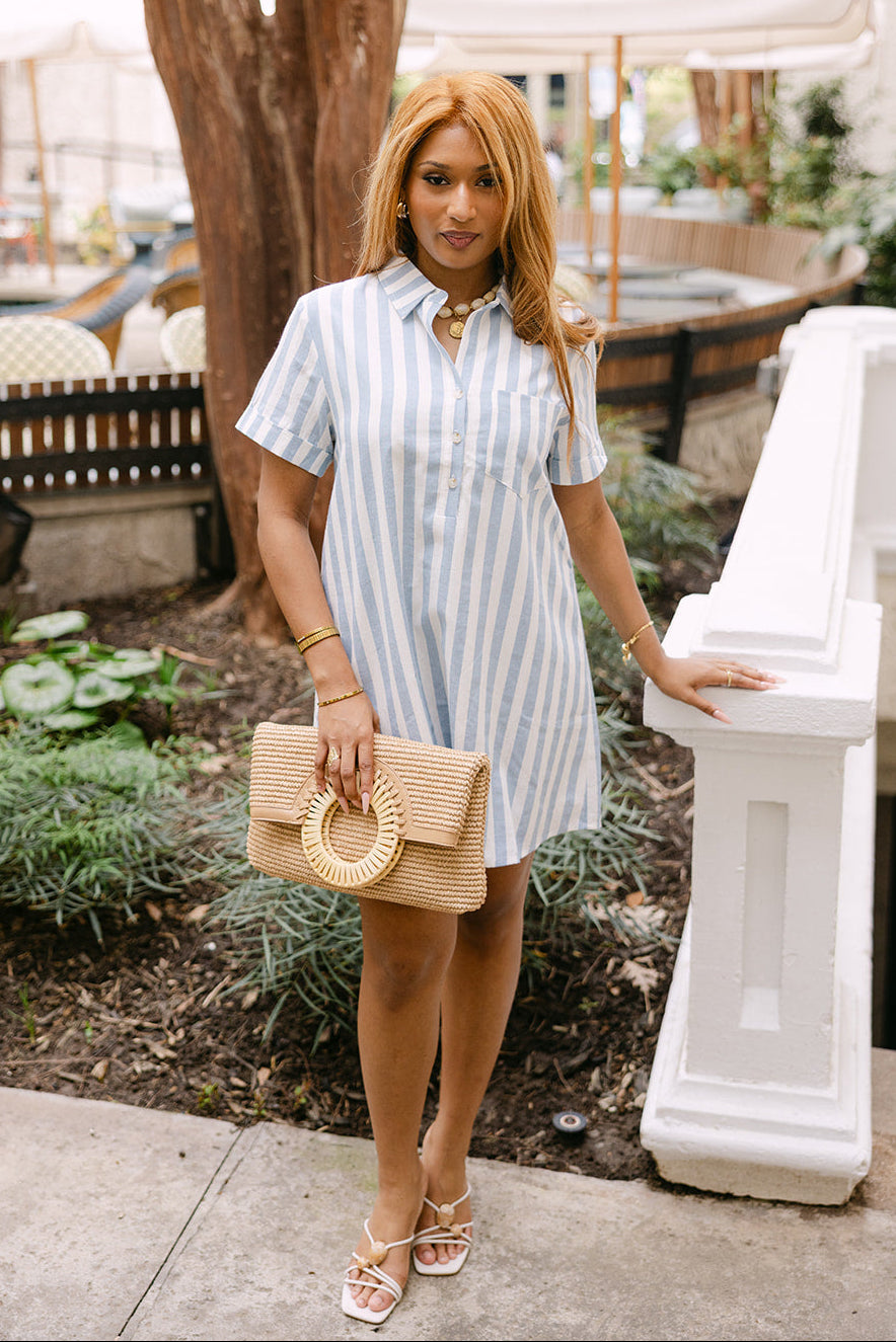 The Saylor Blue & White Stripe Mini Dress is a bright and breezy style made for warm days. Crafted from white and blue lightweight linen fabric, it offers a breathable feel with a fresh, striped look. The white lining adds extra coverage while keeping the dress comfortable to wear.