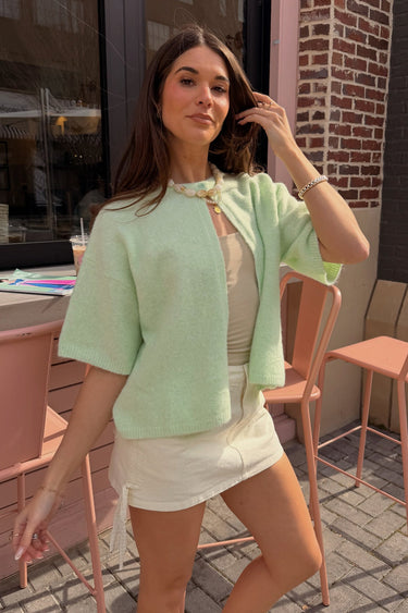 Light, fresh, and effortlessly stylish, the Elyse Mint Green Short Sleeve Cardigan is a perfect layering piece for warmer days. Crafted from soft mint green knit fabric, this cardigan features a classic round neckline and short sleeves for a relaxed, comfortable fit. The front opening is accented with a top button closure, allowing you to wear it open for a casual look or closed for a more polished silhouette.