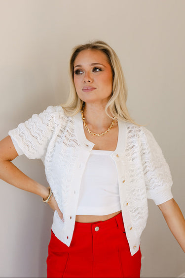 The classic round neckline and front tortoise button up closure create a clean, endless body. While short puff sleeves bring a touch of romantic unique. A ribbed hem provides structure and a flattering fit, balancing the relaxed, breathable knit. Perfect for transitional weather or layering over tops and dresses.