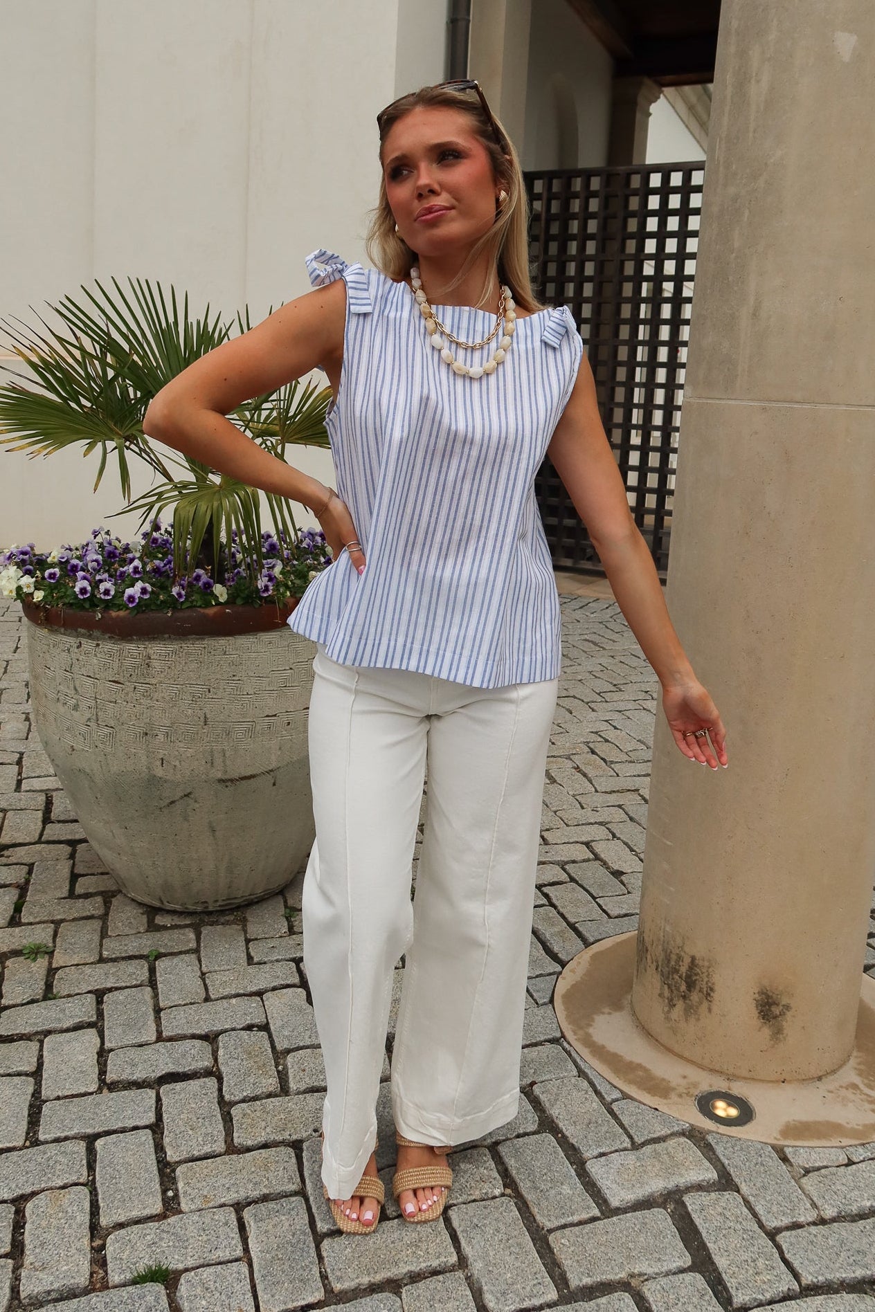 Fresh and effortlessly polished, the Larner White & Blue Striped Tie Tank is a warm-weather staple with a playful twist. Crafted from lightweight white and blue fabric, this sleeveless top features a classic stripe print that feels timeless and easy to style. The high neckline adds a refined touch, creating a clean and flattering silhouette.