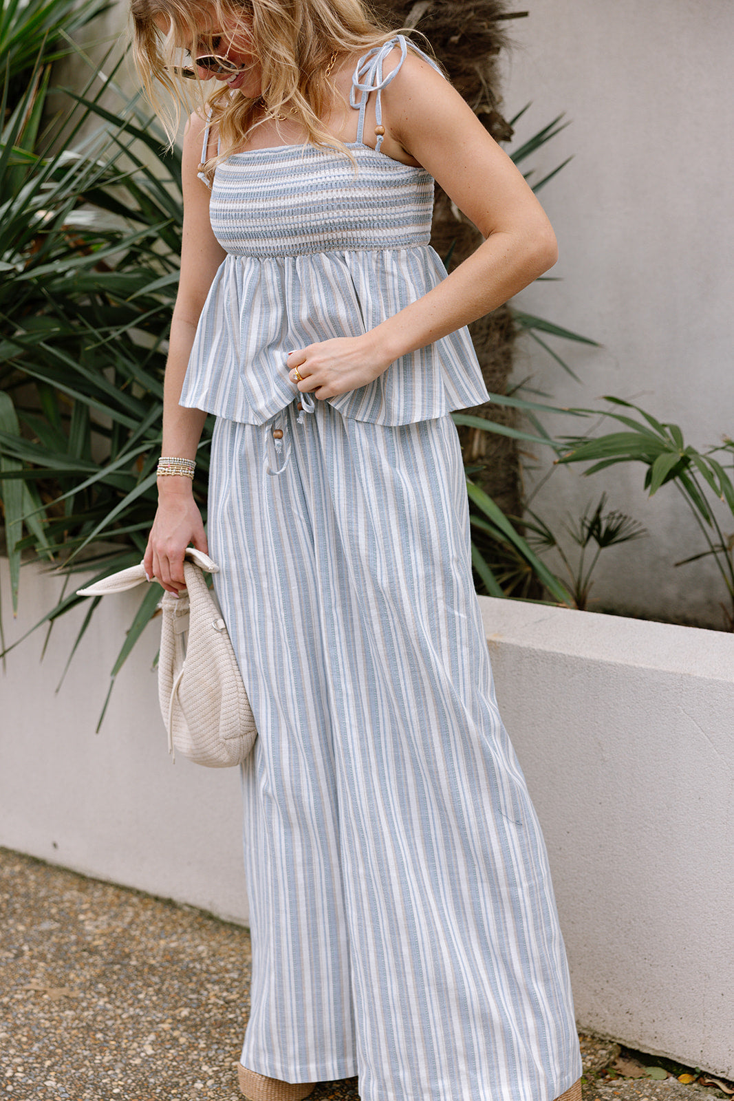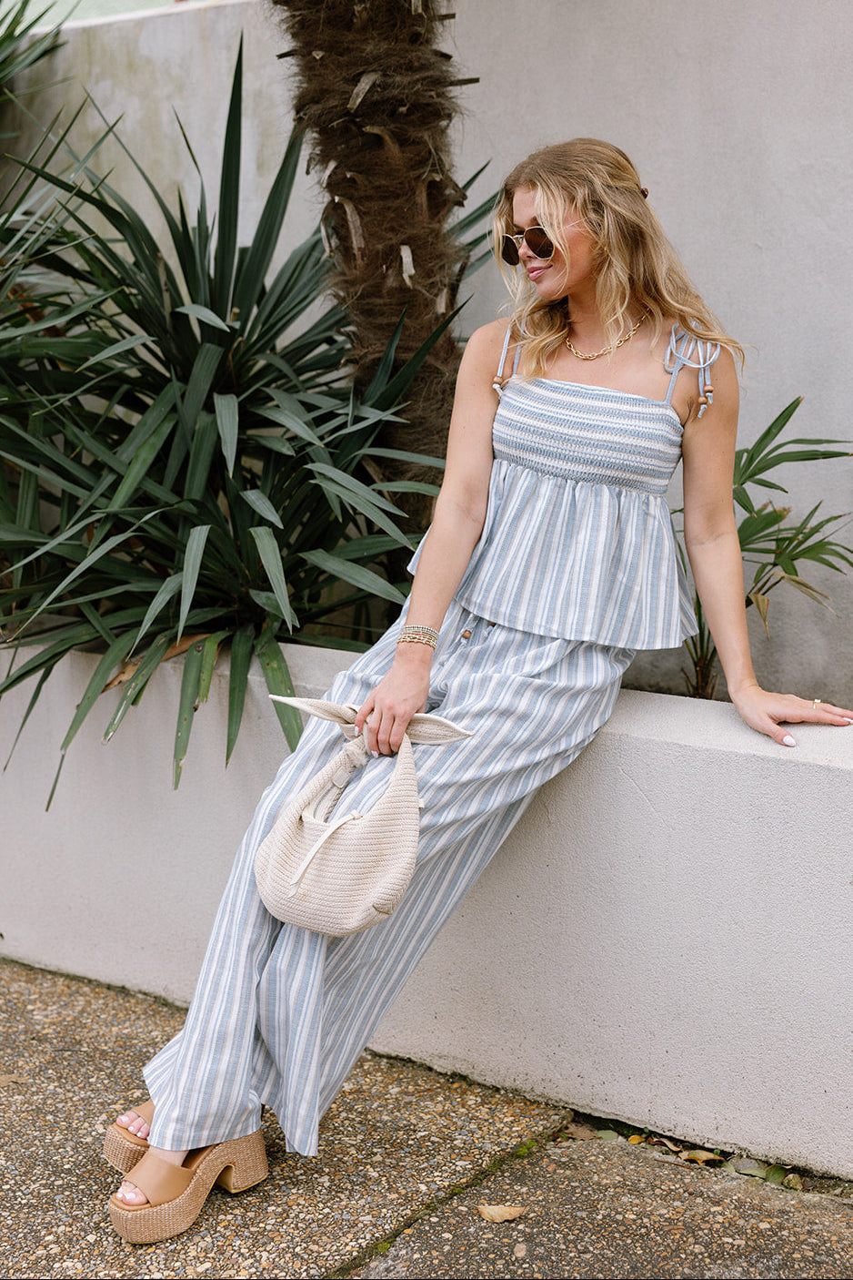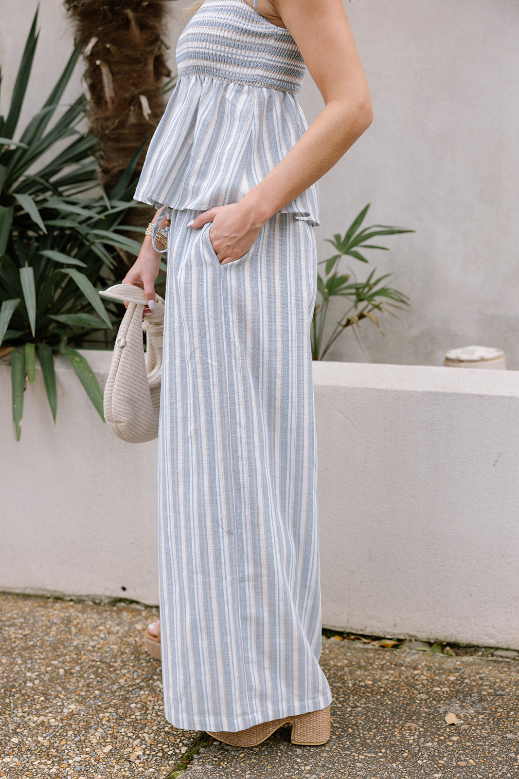The Kalie Blue & Ivory Stripe Pants bring effortless comfort and breezy style to your warm-weather wardrobe. Crafted from lightweight ivory, taupe, and blue linen fabric. These pants feature a classic stripe print that feels fresh and easy to style. The wide leg silhouette creates beautiful movement while keeping the look relaxed and polished.