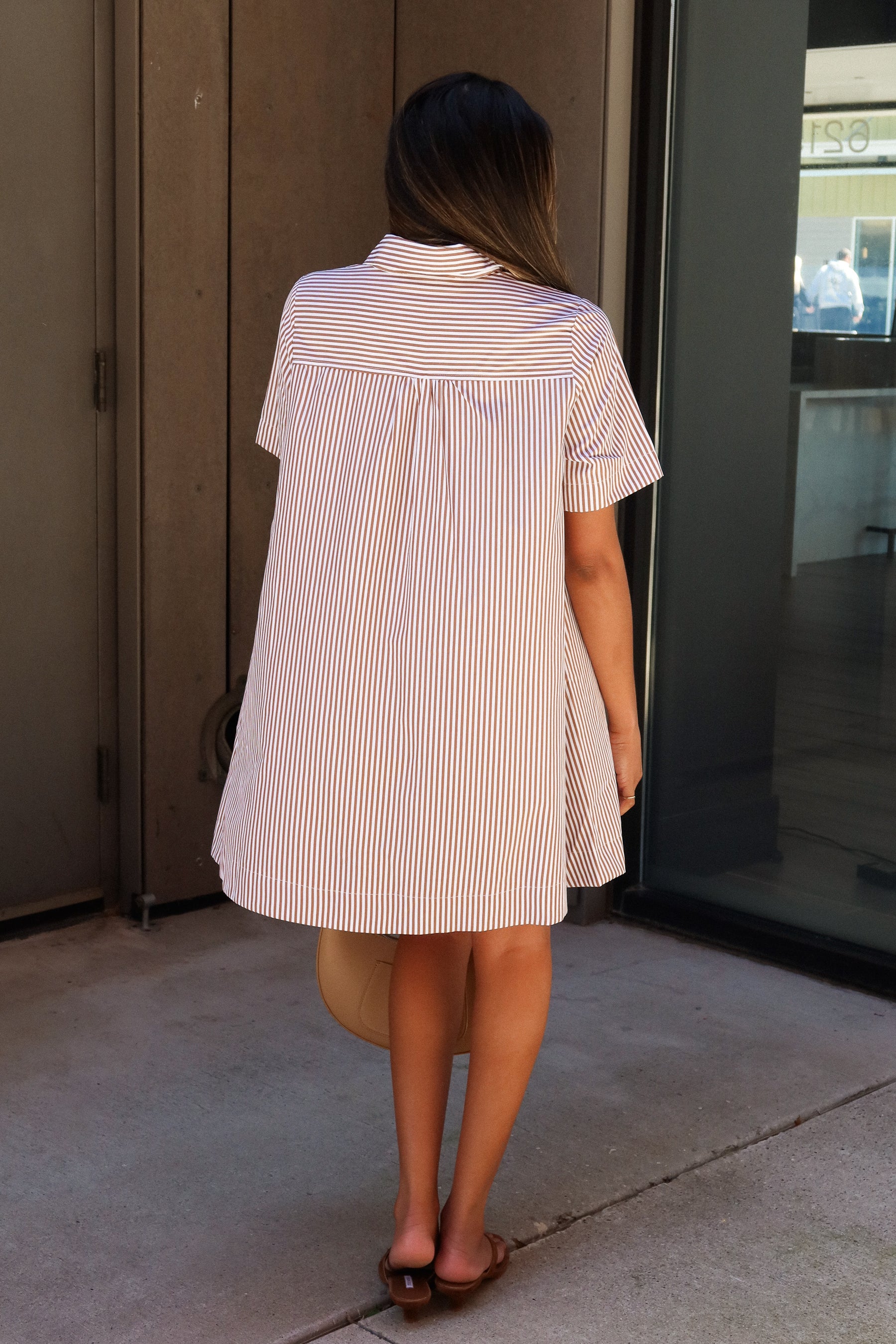 The Trista Brown & White Striped Mini Dress is a warm, effortless take on a classic everyday style. Crafted from lightweight brown and white fabric, this dress features a timeless stripe print that feels both relaxed and polished. The collar neckline and quarter button-up front add a structured touch, while the flare body creates a flattering, easy silhouette.