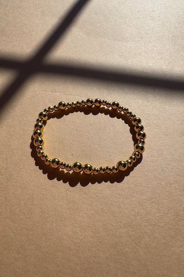 The Skyler Gold Beaded Bracelet offers a stylish blend of durability and elegance. Featuring an alternating pattern of small and medium gold beads crafted from water-resistant stainless steel, this stretchy bracelet is built to withstand everyday wear. Its tarnish-resistant plating with e-coating ensures a lasting shine no matter where your day takes you.