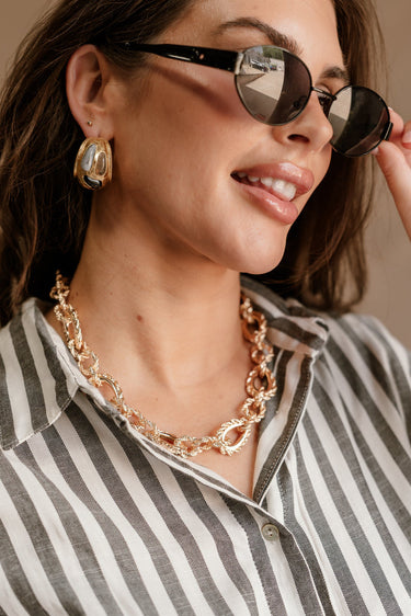 First, the bold gold statement chain adds texture and dimension to any outfit.