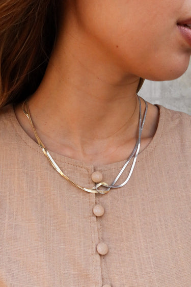 Elevate your everyday style with the Maeve Gold & Silver Knot Layered Necklace. This elegant piece features flat gold and silver layers intertwined with a delicate twist knot detail, creating a chic mixed-metal look. Perfect for layering or wearing solo, it adds a refined touch of contrast and sophistication to any outfit.