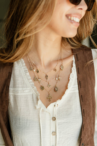The Mariah Gold Layered Medallion Necklace brings together charm and detail with its three radiant gold layers. Each strand features a mix of unique charms including crosses, hearts, stars, pearls, floral accents, snake and bow motifs, a shark tooth, and a quatrefoil design. The varying shapes and textures create a collected, eclectic look that feels both timeless and trend-forward.