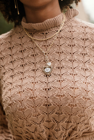 The Mira Layered Gold Heart & Coin Necklace is a charming mix of romantic and vintage-inspired details. This layered piece features a delicate gold roped chain and a gold linked chain for a textured, dimensional look. The dropdown pendant includes a small gold heart and a larger coin-style heart adorned with intricate rose details around the edge, adding a touch of feminine charm.