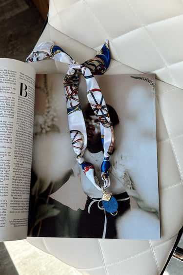 The Sophia Blue Multi & Stone Scarf Necklace brings a fresh pop of color with a touch of western flair. Designed with soft blue multi and white scarf fabric, it’s accented by a striking blue stone centerpiece and polished gold hardware details. Subtle western-inspired prints give this accessory a unique, playful edge, making it the perfect statement piece to style with both casual denim and elevated looks.