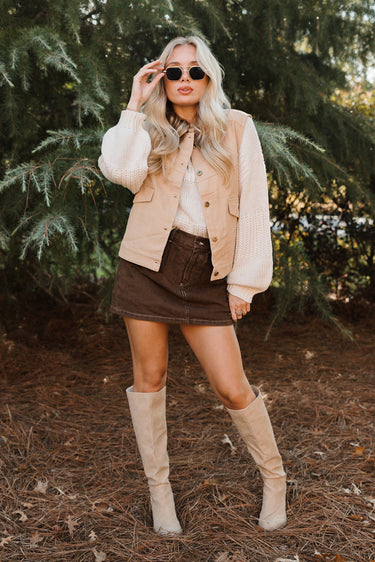 The Evelyn Taupe Denim Barn Vest is a timeless layering piece designed to add both style and function to your wardrobe. Crafted from light camel denim fabric, it offers a structured yet casual look that works well for everyday wear. The dark taupe collar neckline creates a striking contrast against the lighter body of the vest, making it easy to pair with a variety of tops. Its sleeveless cut allows for flexible styling, whether you’re layering it over a long sleeve shirt, a lightweight sweater, or even a casual dress for a rustic-inspired outfit.