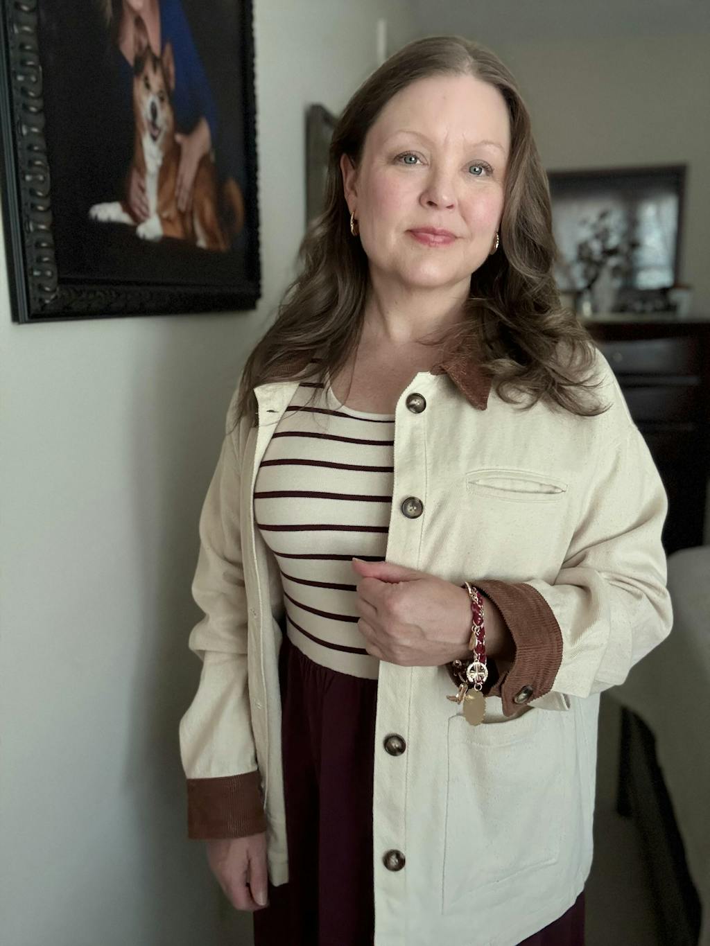 Perfect for layering through the cooler months, this versatile piece pairs seamlessly with everything from denim jeans to casual dresses or separates. Its relaxed yet polished silhouette makes it an easy go-to for day-to-day outfits. While the vintage-inspired details elevate its overall appeal.