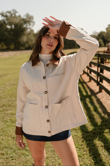 The Georgia Cream & Brown Barn Jacket is a timeless layering piece that beautifully blends classic details with a modern fit. Crafted from soft cream fabric, this jacket exudes understated elegance, while the brown corduroy accents on the collar and wrists add a nostalgic touch of vintage charm. The tortoise button-up front gives the jacket an elevated, refined finish, making it as stylish as it is functional.