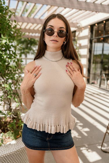 Elegant and effortlessly chic, the Vera Taupe Ribbed & Ruffle Tank is a versatile staple for any wardrobe. Crafted from soft taupe ribbed knit fabric, it offers a flattering fit that drapes beautifully on the body. The high neckline adds a polished touch, while the delicate ruffle hem brings a hint of feminine charm.