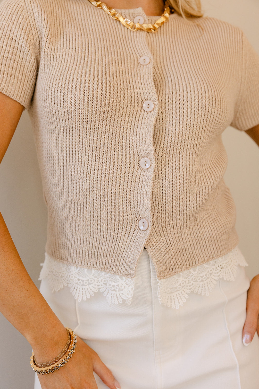 Effortlessly chic, it pairs beautifully with denim, skirts, or tailored pants for both casual and polished ensembles. Whether worn buttoned up as a top or layered open for a relaxed feel, the Estelle Taupe & White Lace Cardigan blends softness, sophistication, and feminine charm.