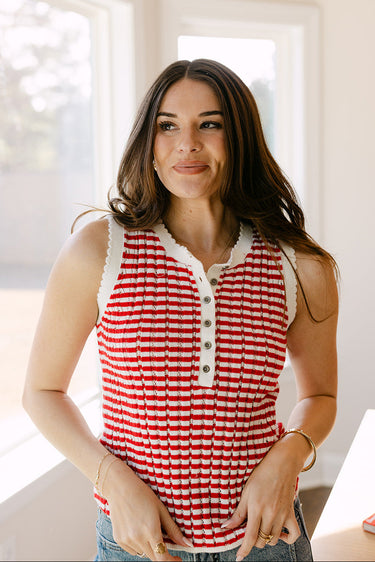 The Poppy Red & White Striped Tank Top is a playful, polished knit perfect for warm days and easy layering. Made from red and white knit fabric, this tank features a classic stripe print with a quarter button-up detail at the neckline for a touch of charm. The round neckline keeps the look timeless, while the scalloped hem adds a feminine finish.