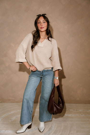 The Kitt Beige 3/4 Sleeve Sweater is an effortless staple designed with comfort and versatility in mind. This sweater features a flattering V-neck with a rounded neckline detail that adds subtle dimension to a classic silhouette. Side slits provide ease of movement and a relaxed, modern fit.