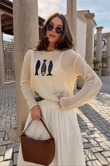 A bold navy stitch fish graphic adds a unique, eye-catching detail, giving this sweater a fun yet updated coastal inspired vibe. Designed with a classic round neckline and long sleeves. It delivers a timeless silhouette that’s easy to wear and endlessly versatile. The comfortable fit makes it ideal for relaxed days while still feeling thoughtfully styled.